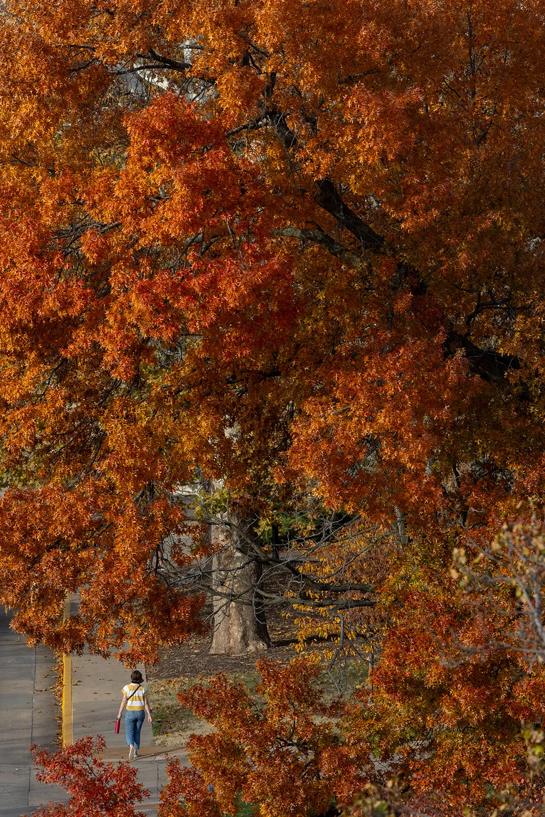 A student walks down the sidewalk as the oak trees turn color on campus.