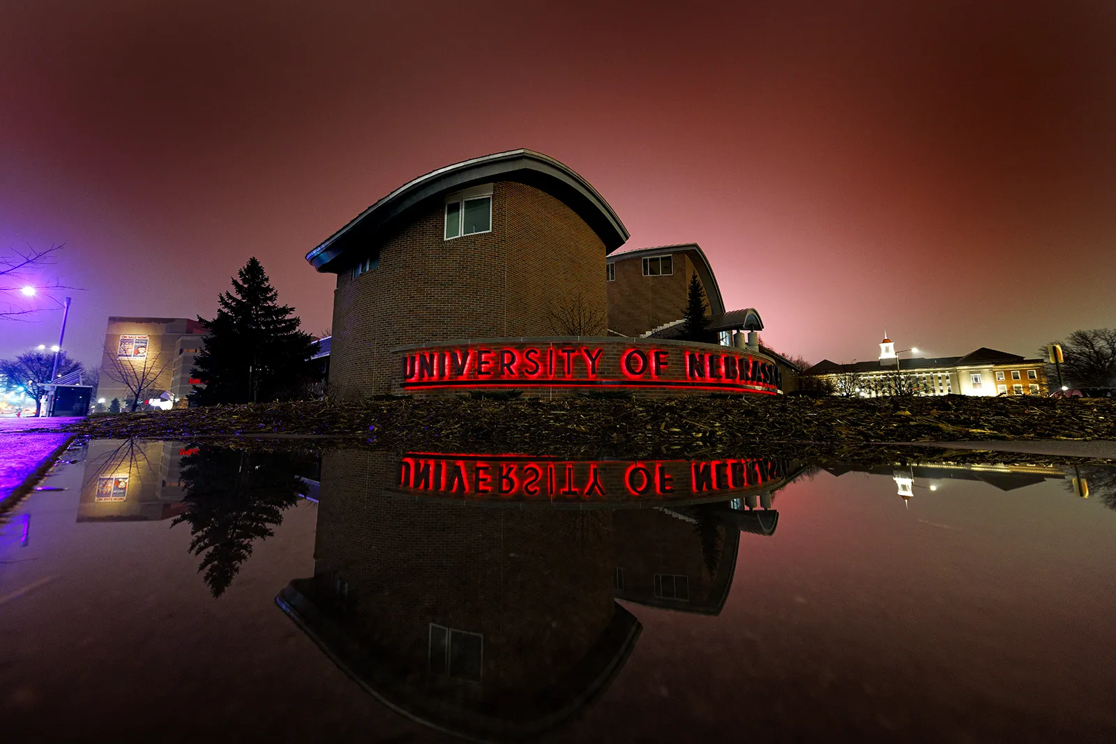 On a rainy evening the sky glows red over campus. The red glow appears every time the football stadium turns the lights red as the Cornhuskers host a recruit for a visit. It's like the bat signal hoping for our next superhero.