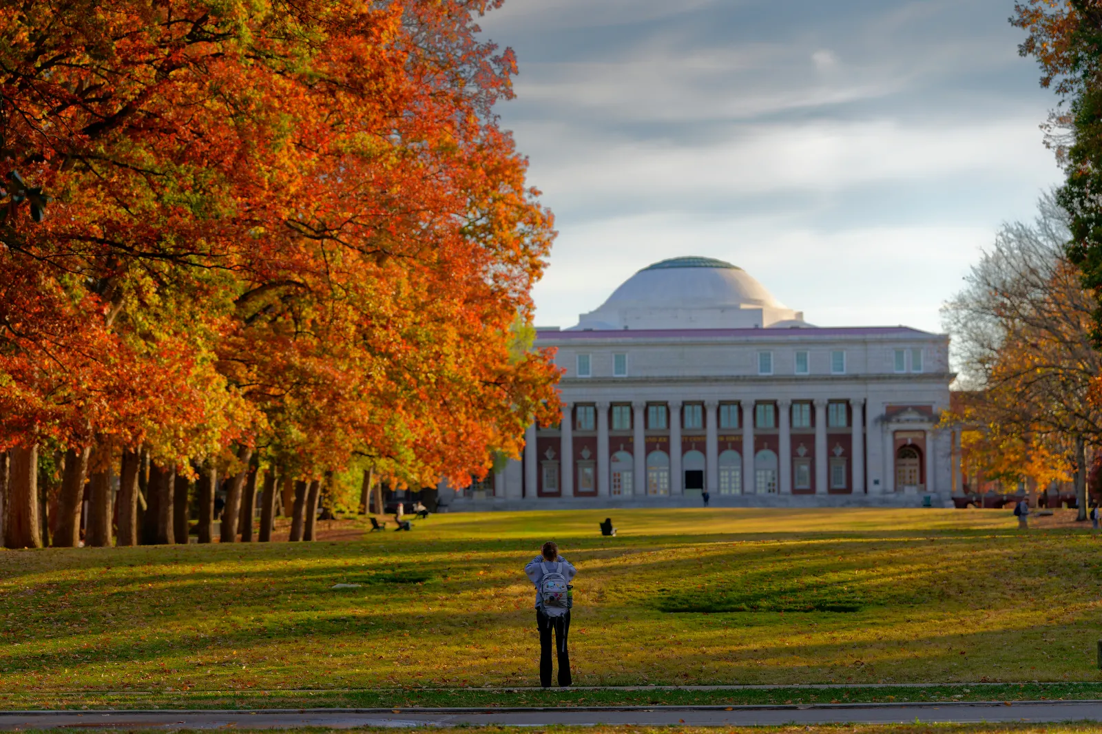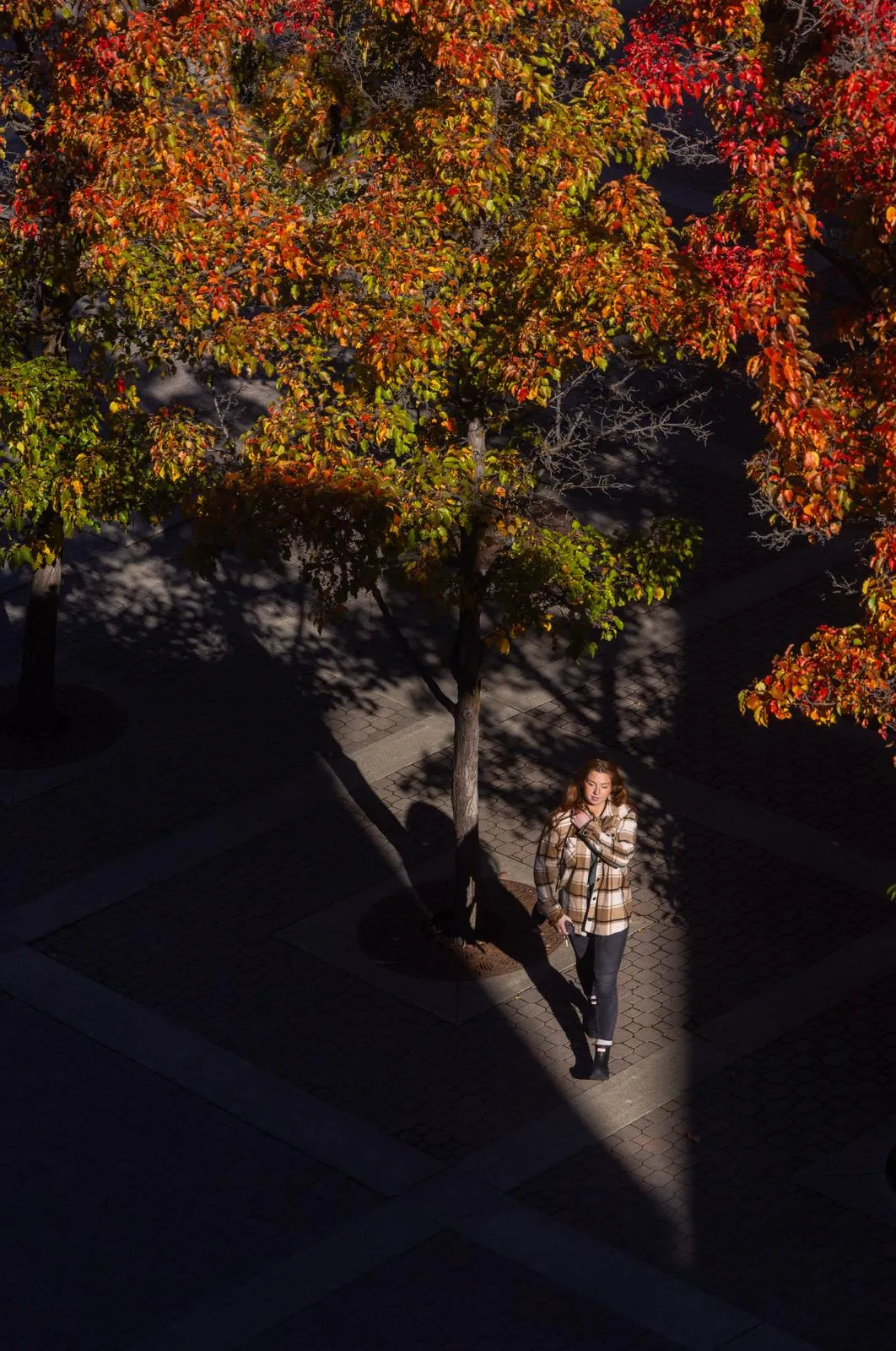 A business student walks thru a sliver of sunshine outside Barge Hall. Fall colors were at peak this week across campus.