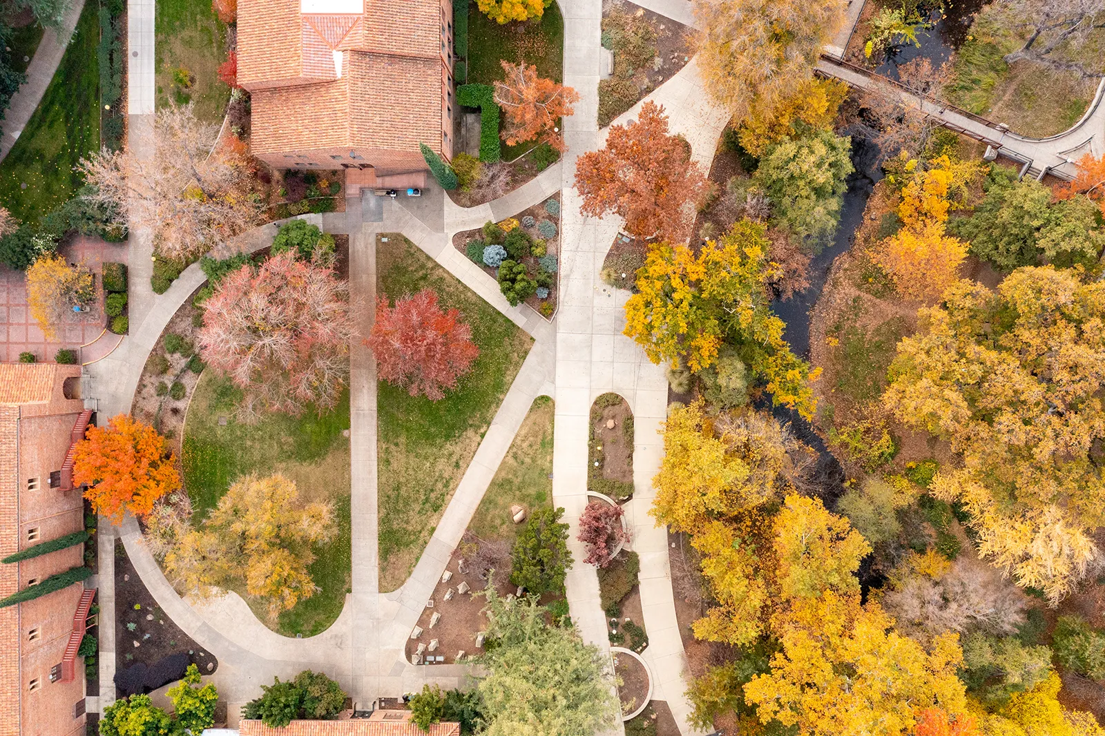 An aerial view of campus fall colors on Thursday, November 30, 2023 in Chico, Calif.