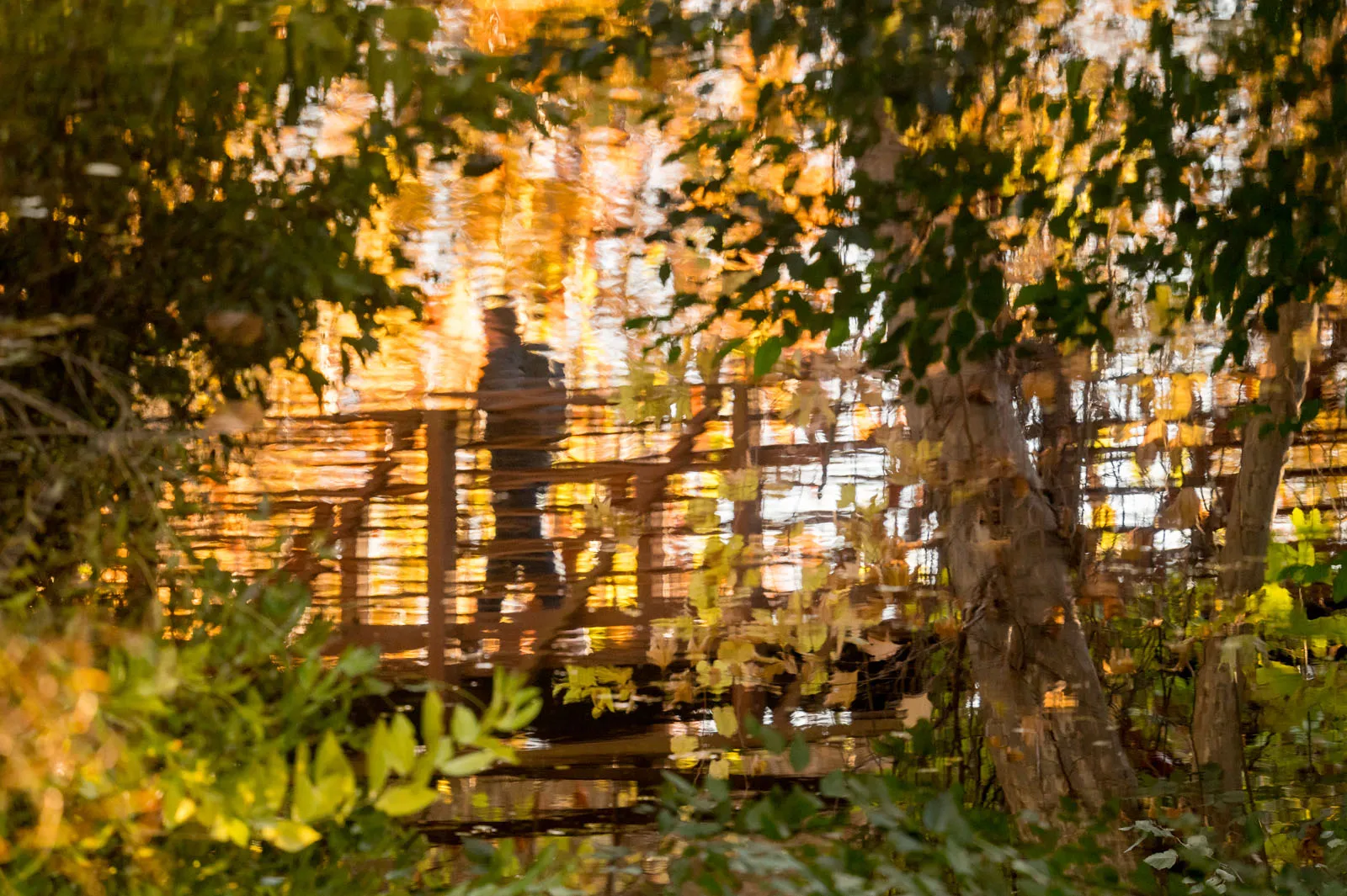 A student walking across a bridge surrounded by the colors of the autumn leaves are reflected in Big Chico Creek.