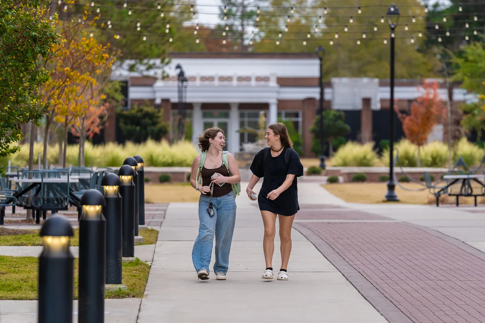 UNCW students walking together enjoying the nice autumn weather at the Student Housing Quad in early November 2023.