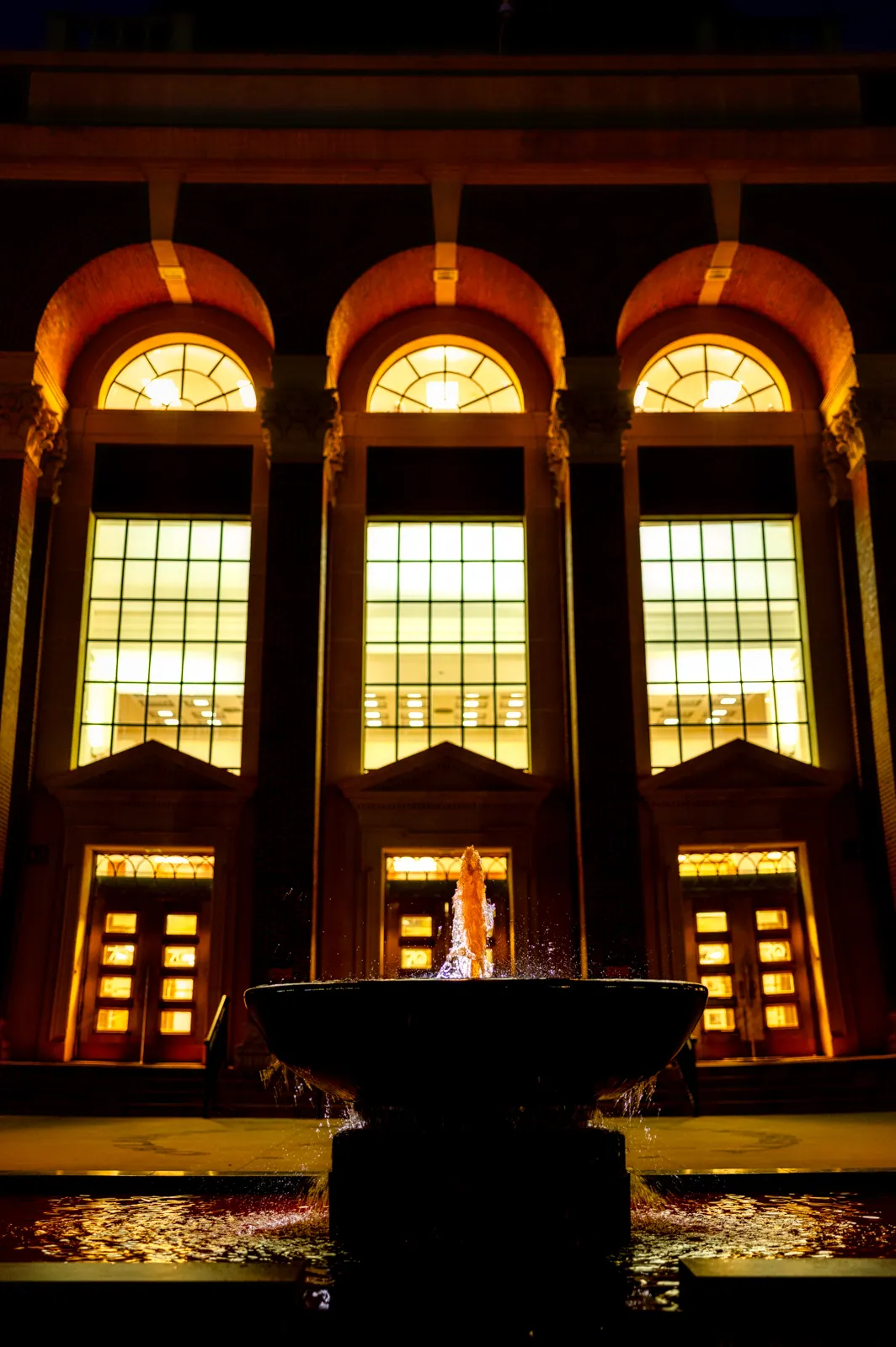 The Edmon Low Library fountain is dyed orange for the Bedlam rivalry game against Oklahoma on November 4, 2023.