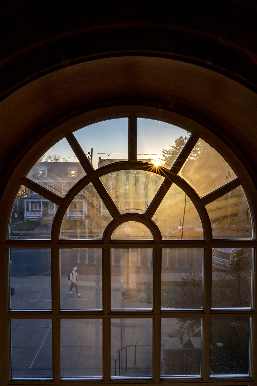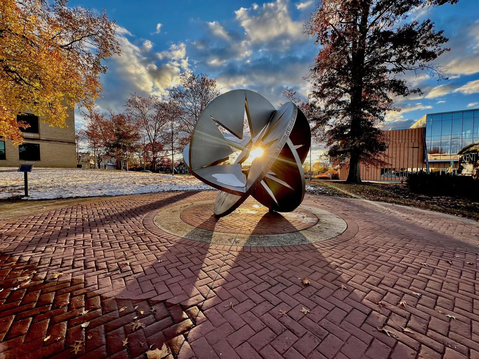 The evening sun shines through the "Starsphere" sculpture near Franklin Hall.