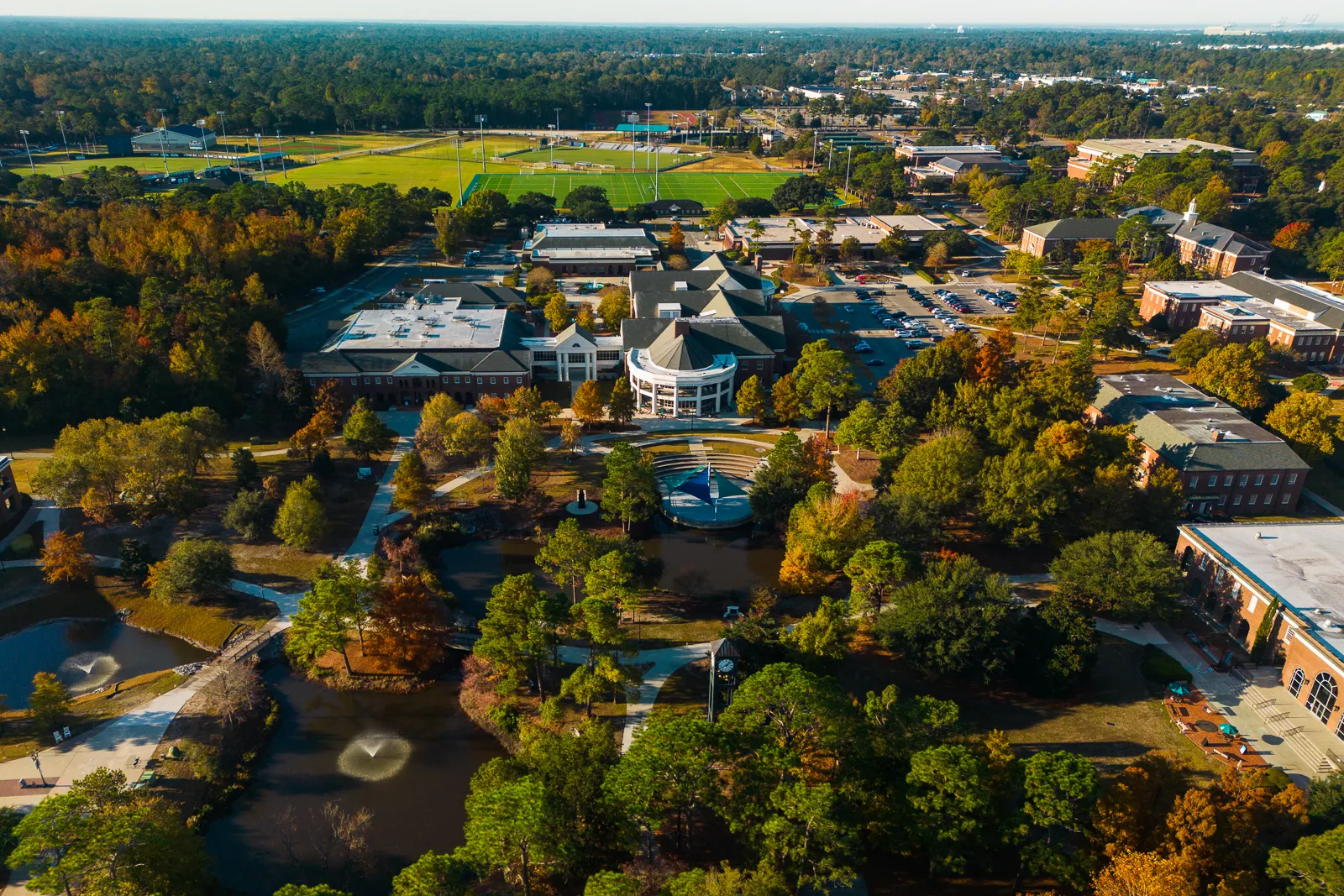 UNCW's Campus Commons on a beautiful autumn morning in November 2023. This early morning image captures the expansive common area connecting most of campus while showing off the changing of the seasons.