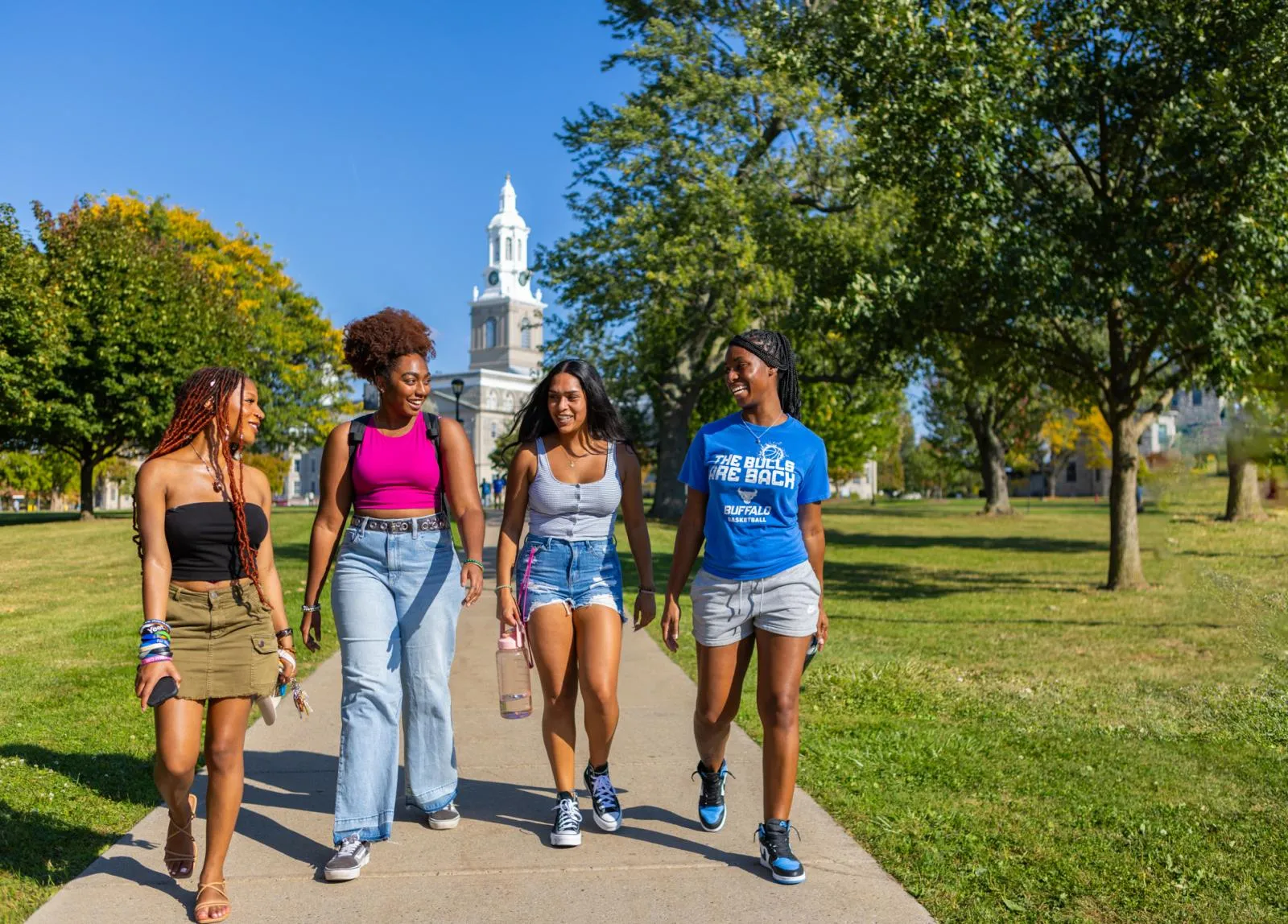 A group of students walking on the South Campus with Hayes Hall behind them.