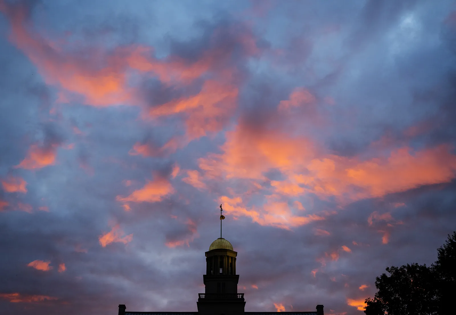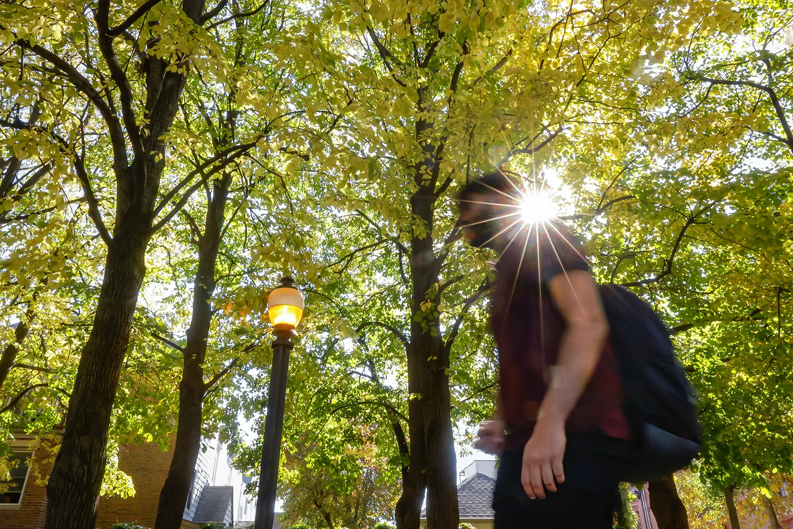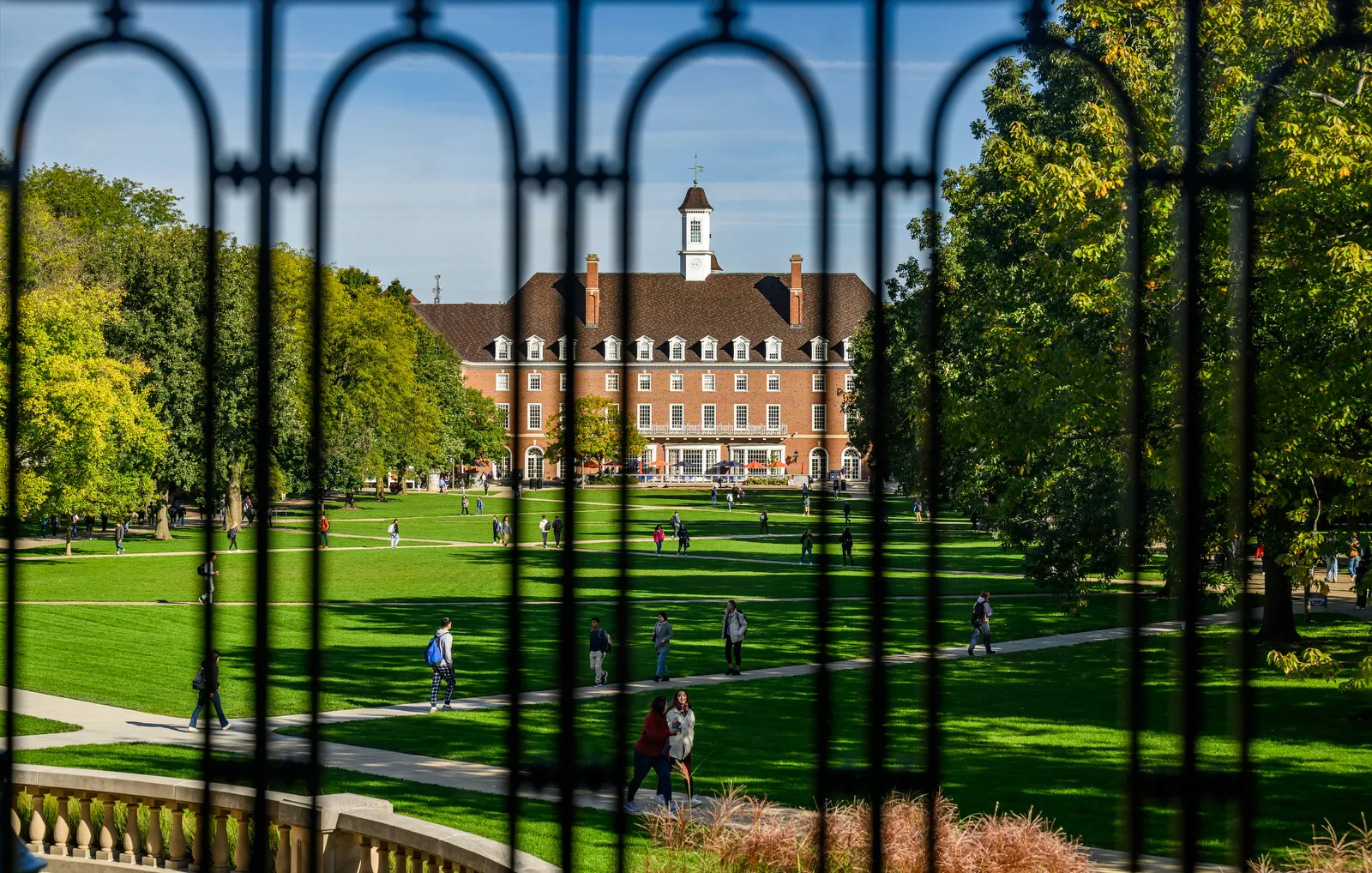 The main quad, as seen through ornamental iron work from Foellinger Auditorium, is full of life as students make the most of an autumn day.