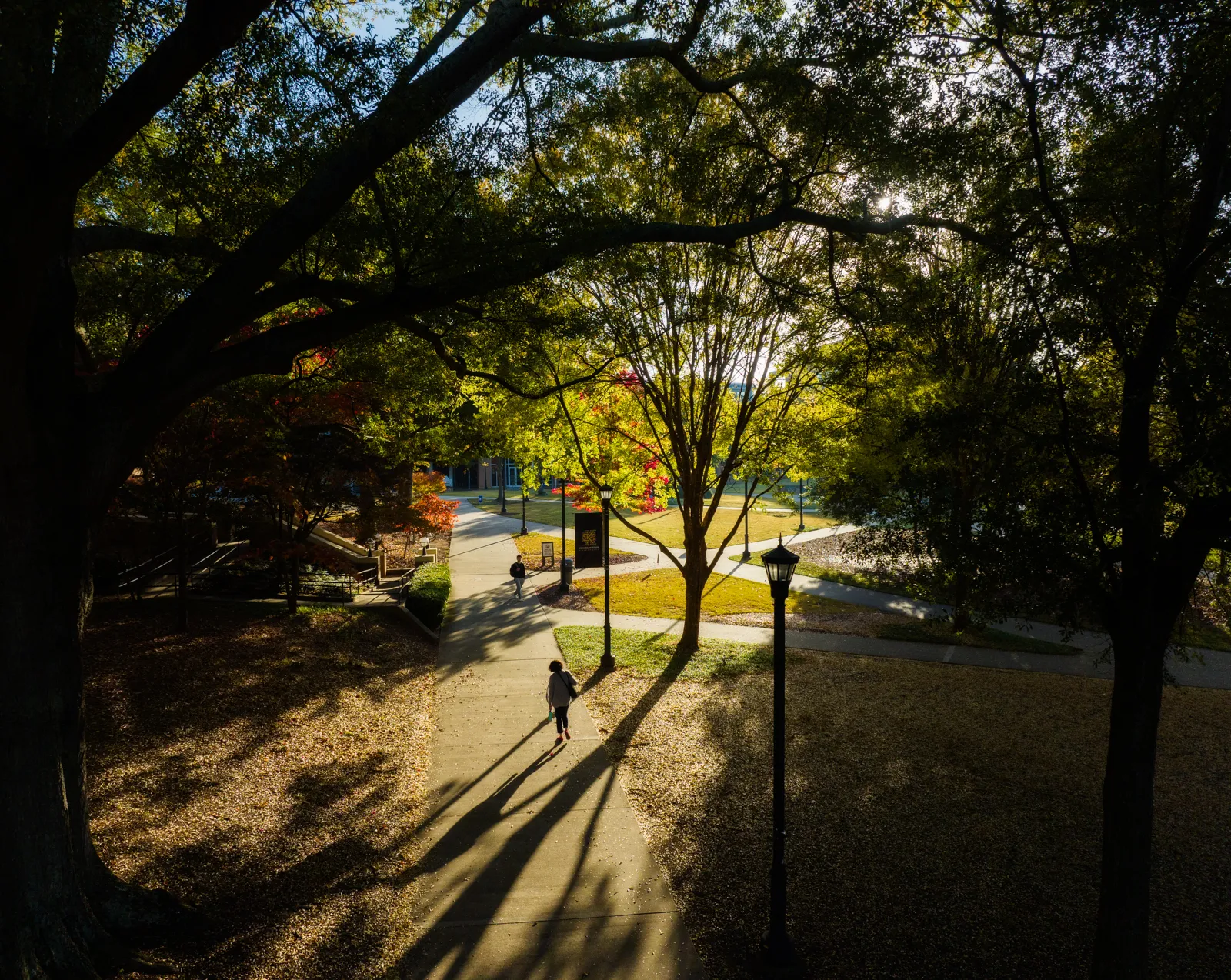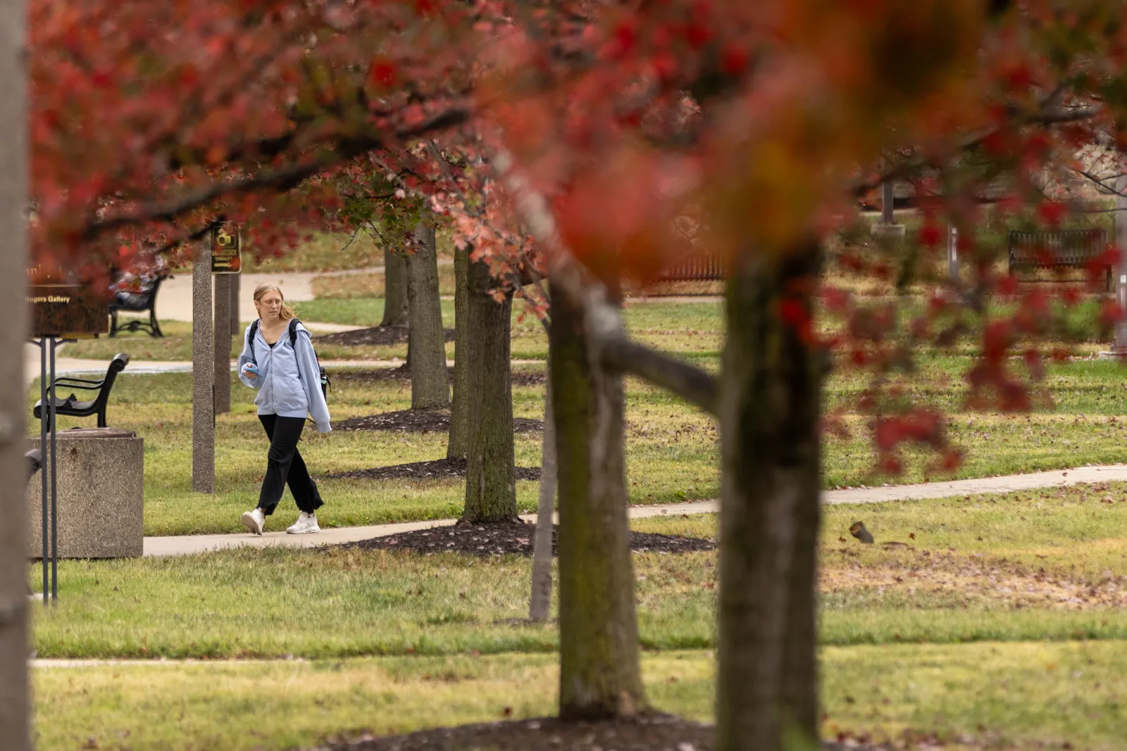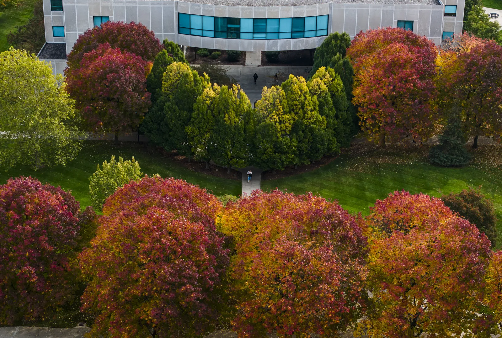 People walk on paths near Wiekamp Hall in this aerial photograph of fall foliage Wednesday, Oct. 18, 2023 on campus at IUSB