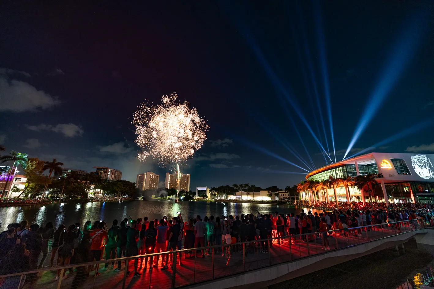 Folks line up on Fate Bridge to watch the fireworks and laser show over Lake Osceola as part of Hurricane Howl and homecoming weekend activities.