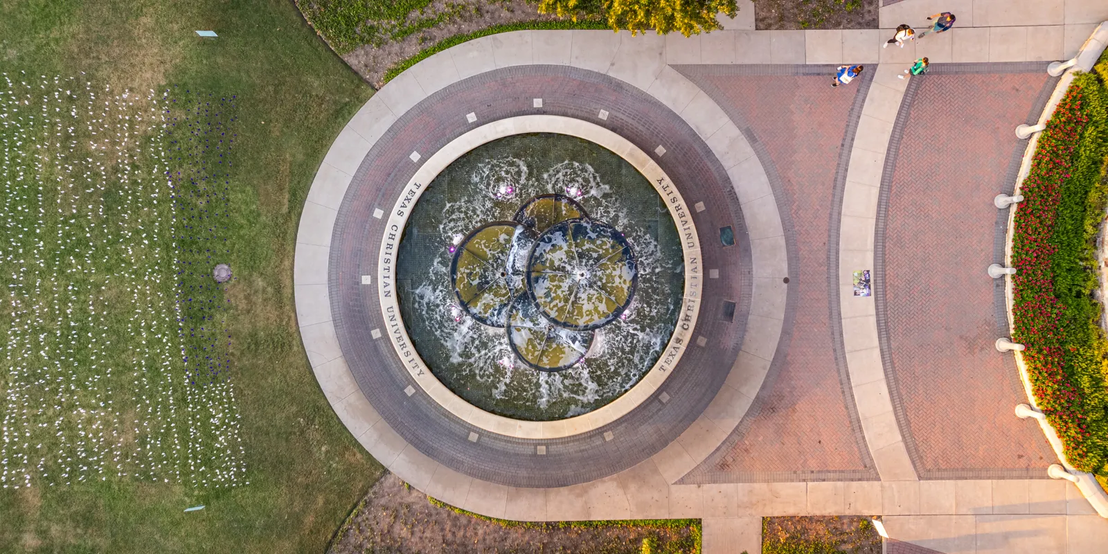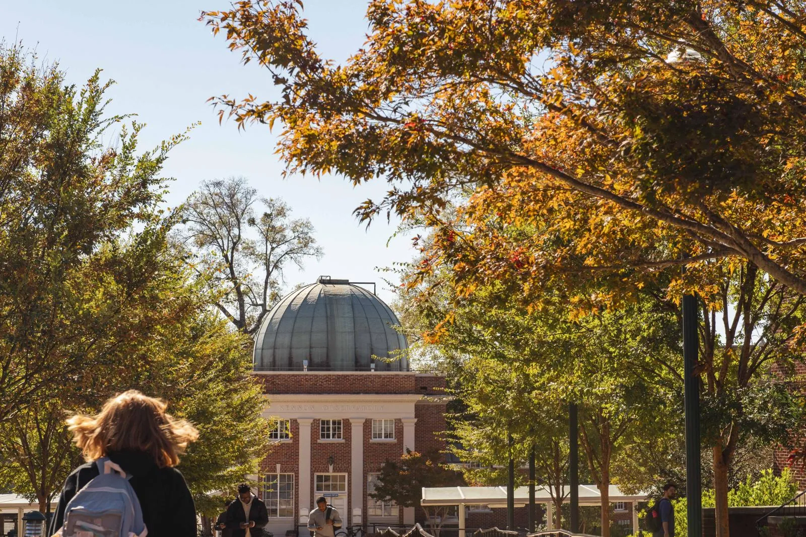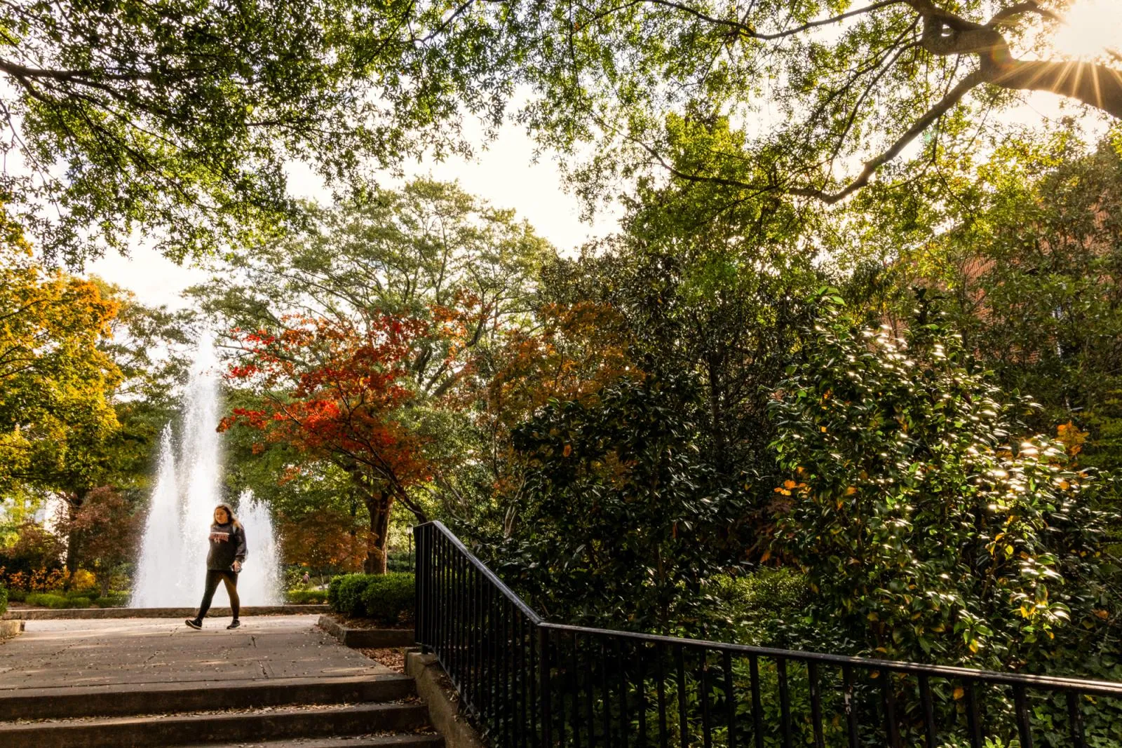 A University of Georgia student walks past Herty Fountain surrounded by fall foliage.
