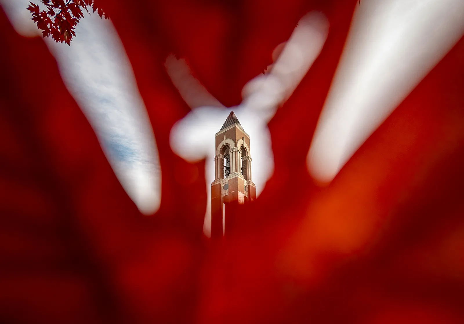 A red leaf frames the iconic Shafer Tower. Shafer Tower is a 150-foot-tall free-standing bell tower with a carillon and chiming clock in the middle of the campus of Ball State University.