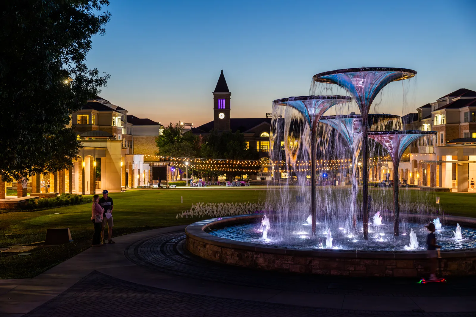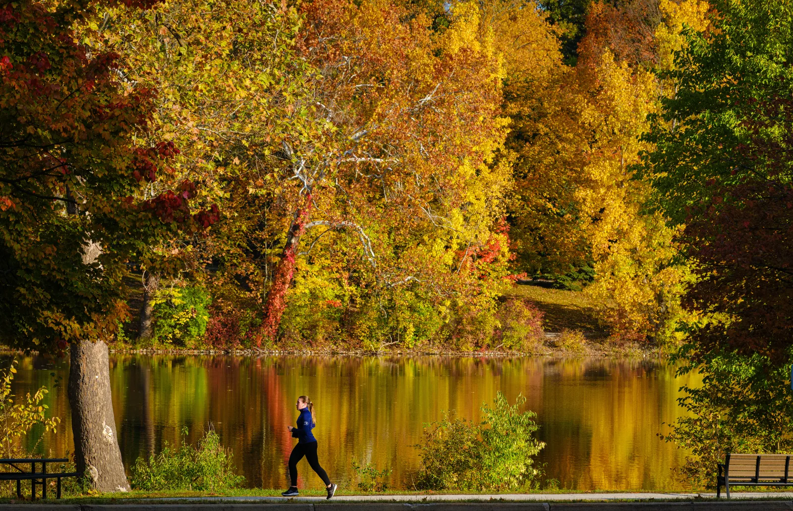 Students traverse campus, passing by trees adorned with the vibrant hues of changing leaves.