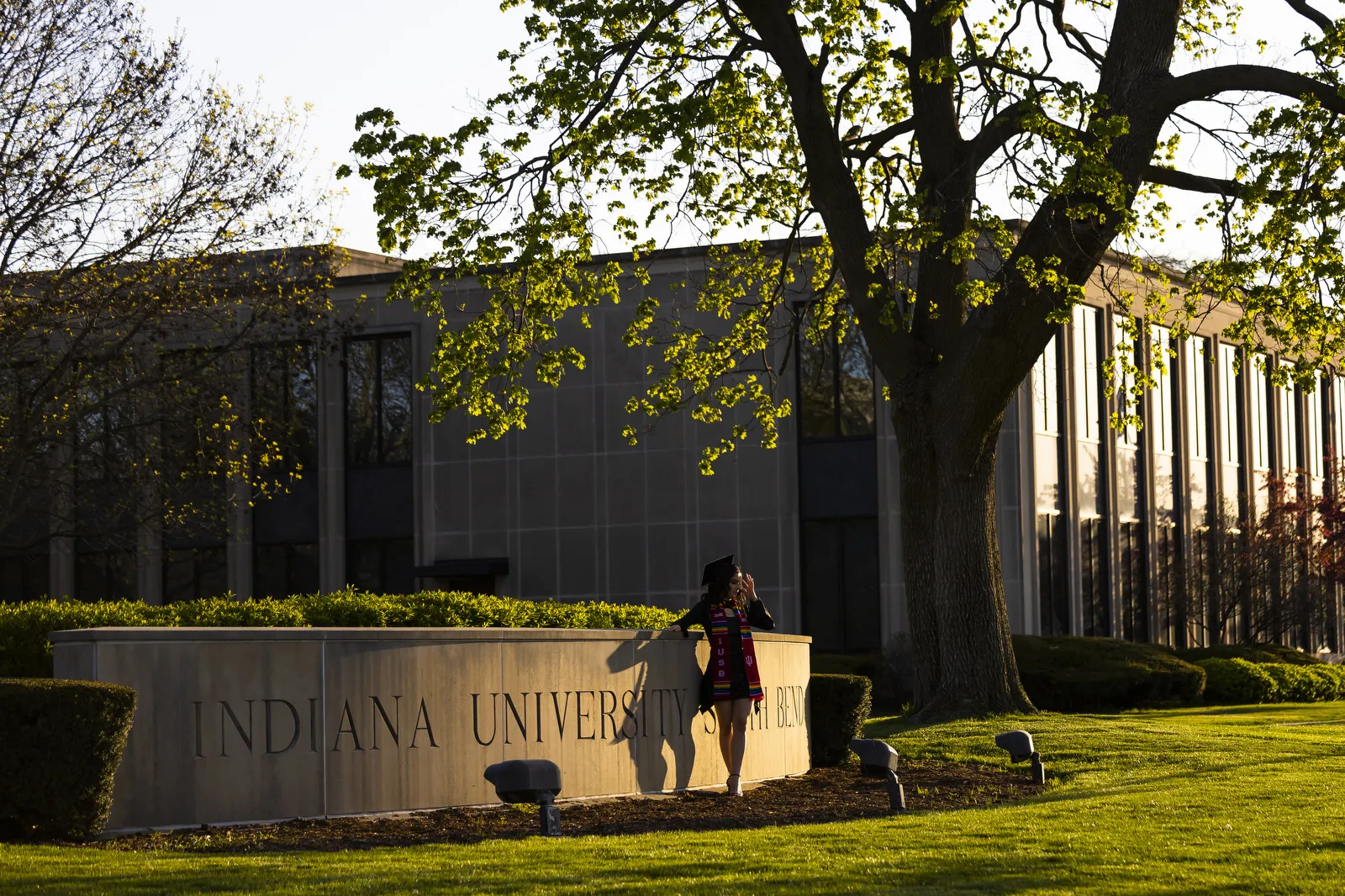 Healthcare Management graduate Emily Longines fixes her hair during a graduation photoshoot Thursday, May 4, 2023 on campus at IUSB.