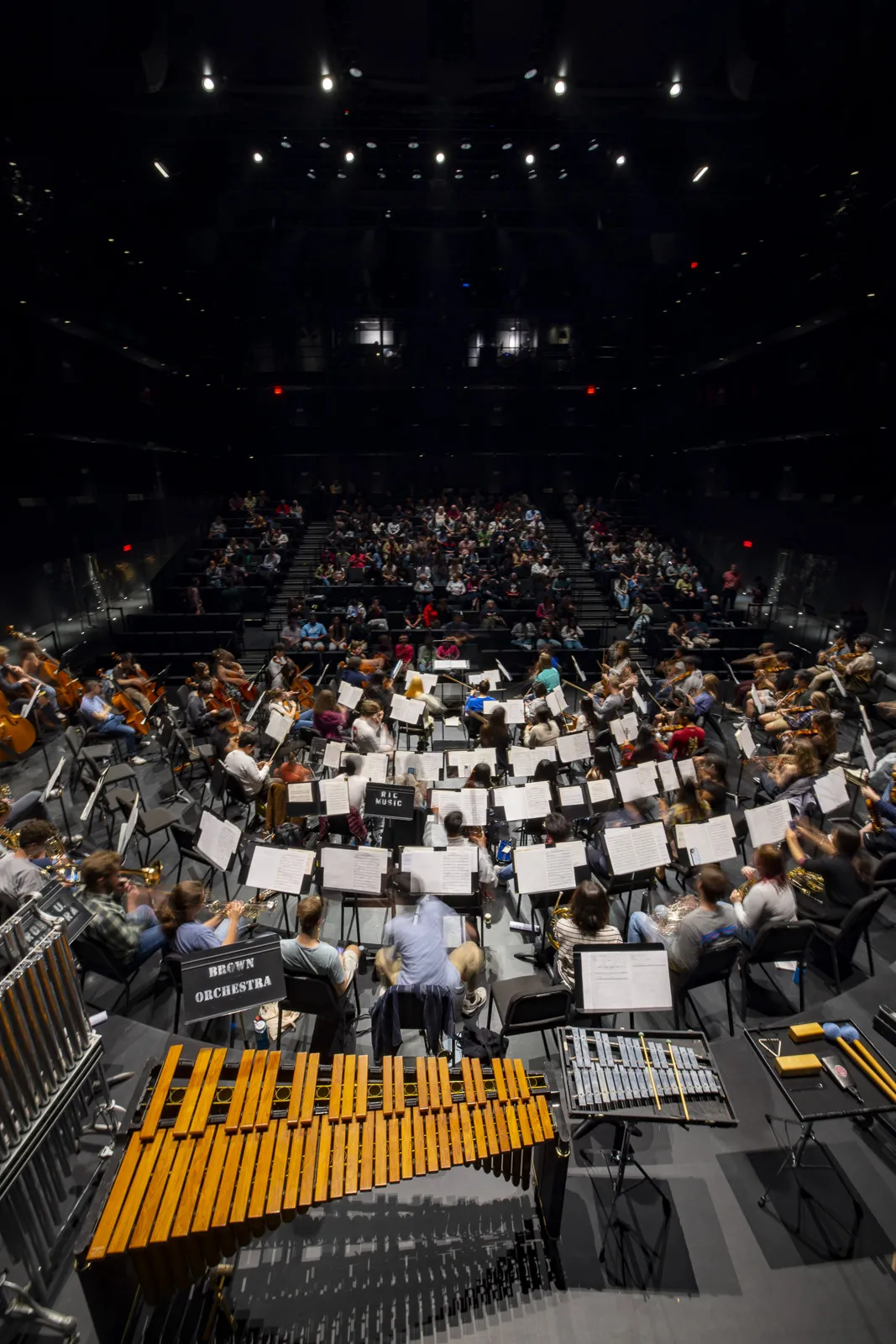 A photo of the orchestra getting ready to play a show in a new performance hall on campus during the building's "tuning period.'