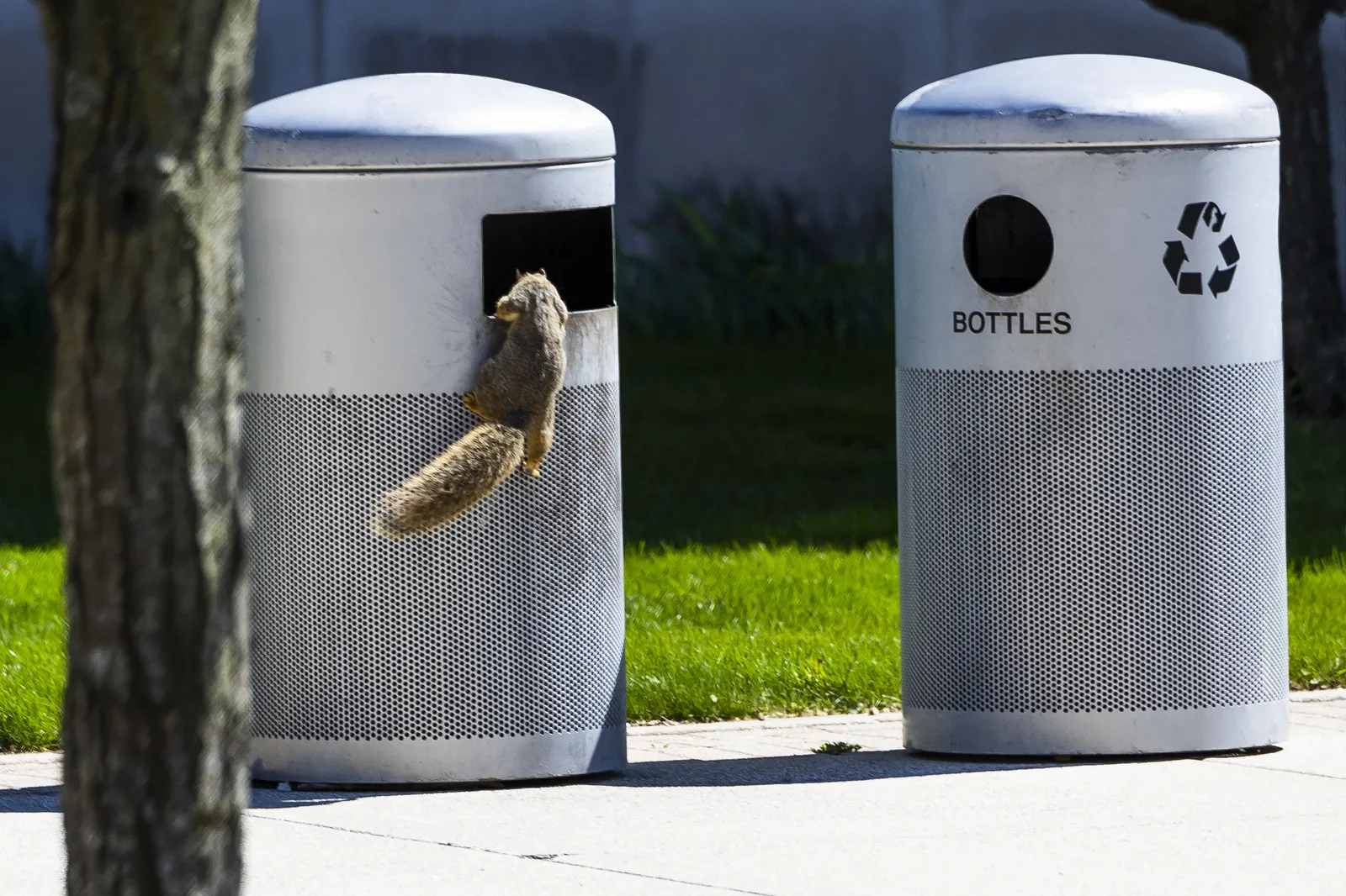 A squirrel looks into a waste bin near the Franklin D. Schurz Library Wednesday, April 26, 2023, on campus at IUSB.
