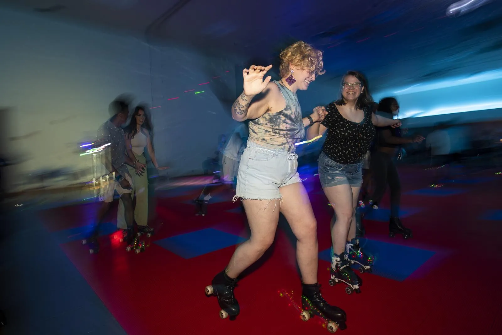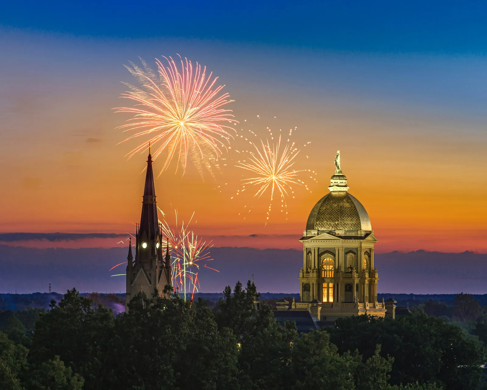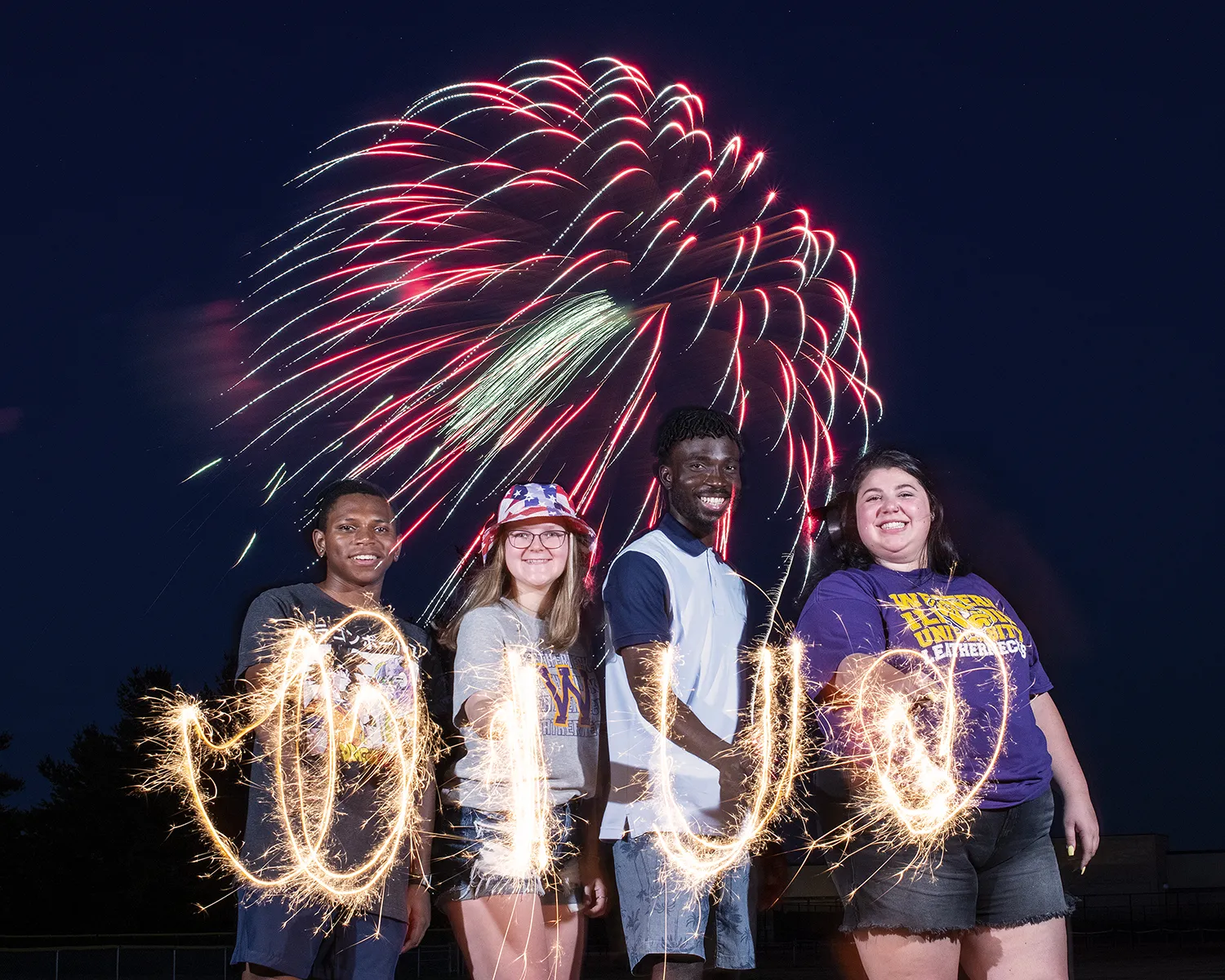 Students Armon Kelly, Megan Hynek, Olabode Soetan, and Destinee Jaquez pose with sparklers in front of the July 4, 2022 fireworks display for a in-camera long exposure with rear sync flash.