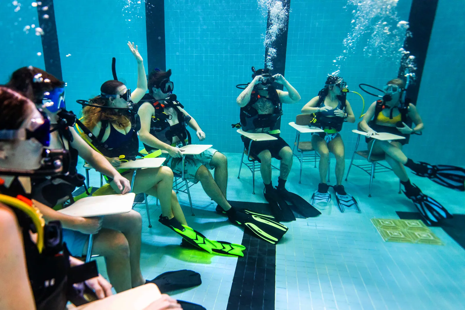 A dive class takes their classroom to the bottom of the pool after the instructor was asked to “vary” his training environment.