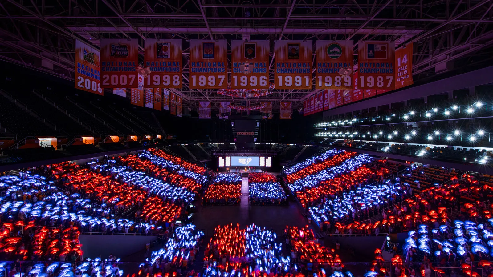 The Class of 2026 celebrates after taking an oath of loyalty and pledge of allegiance during Torch Night.