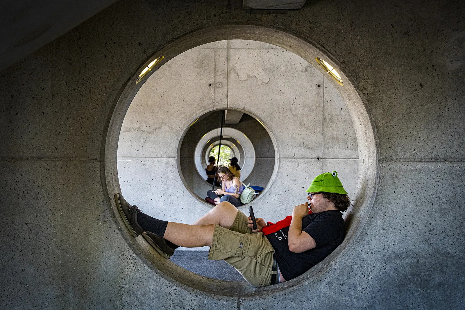 Stony Brook, NY; Stony Brook University: A student hangs out at the Wolfie’s Welcome Bash After Dark Park.