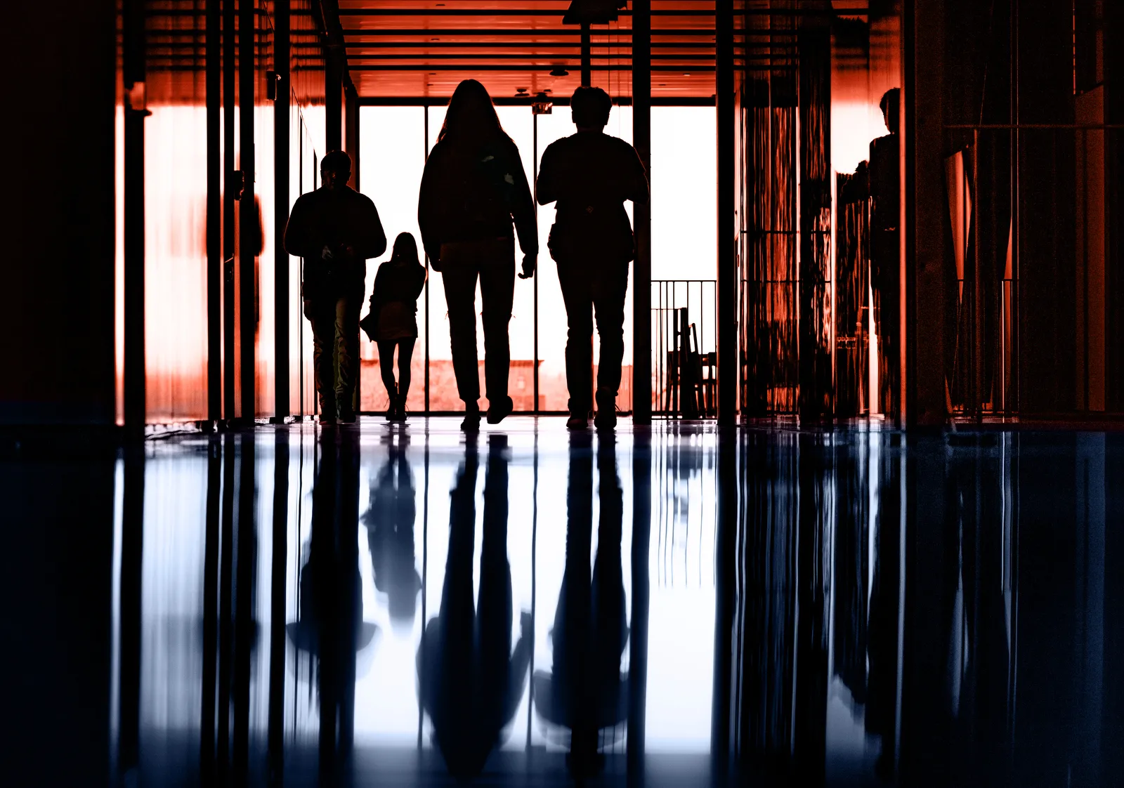 During class crossover time, students head out from a design class at the Campus Instructional Facility.