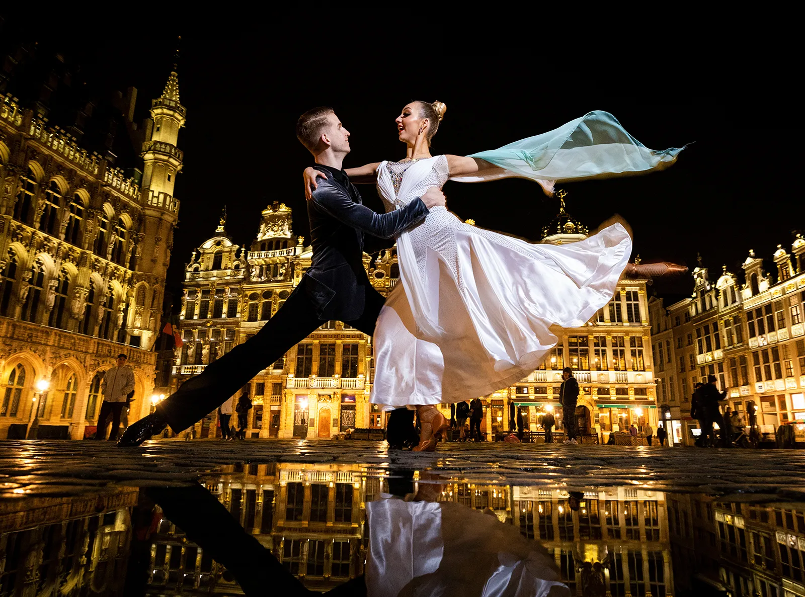 Robert and Jenna McShinsky dance in the Grand Place while touring with the Ballroom Dance Company in Brussels, Belgium.