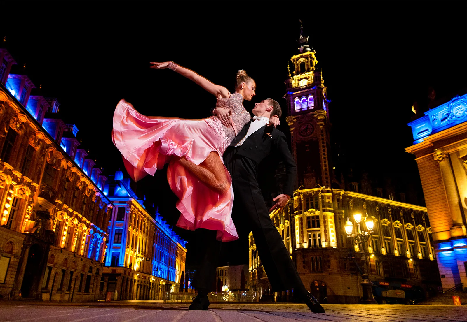 Ballroom Dance Company members Derrick Davis and Nicole Mendenhall dance in the deserted town square of Lille, France.