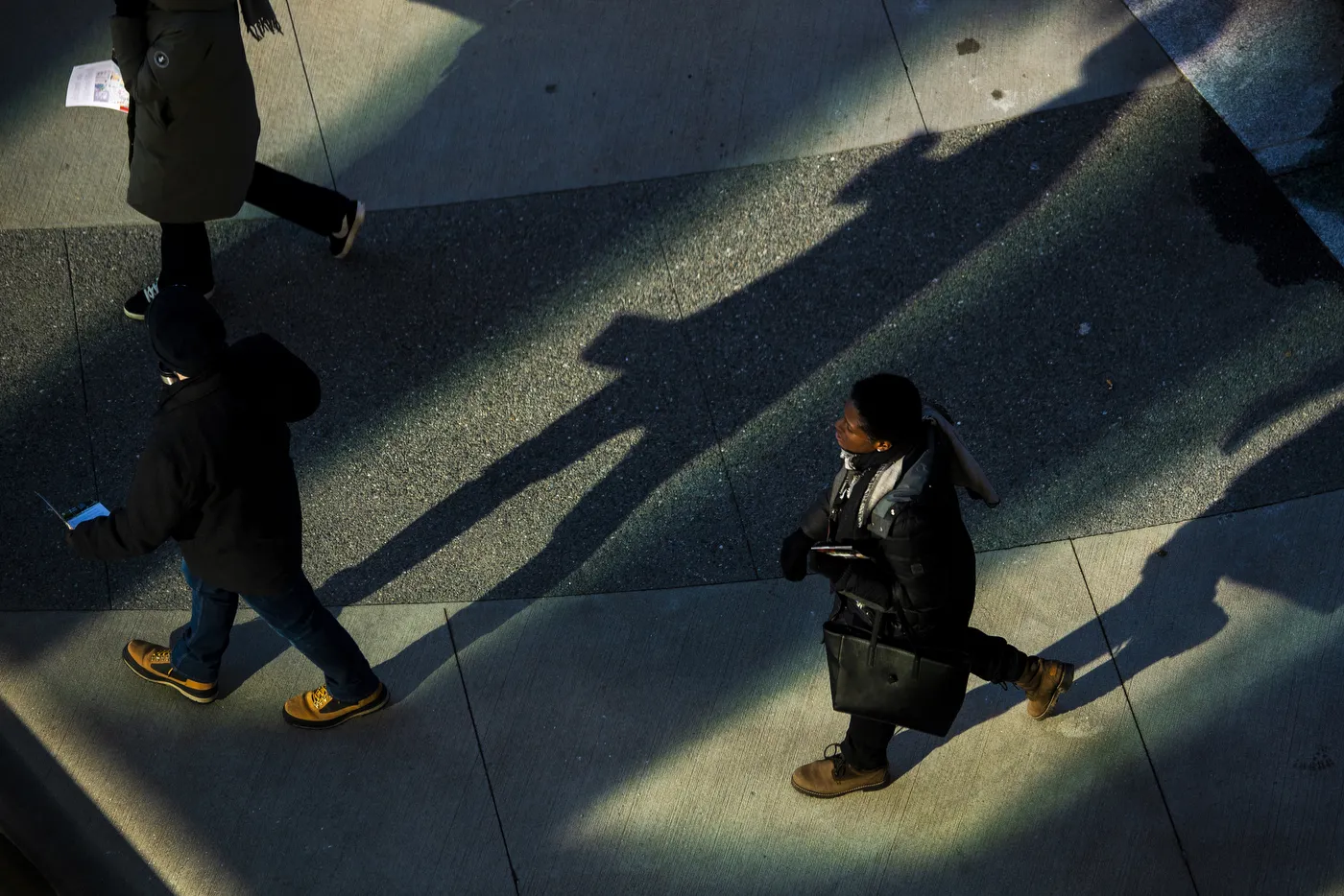 Students and faculty cast shadows beneath the Interdisciplinary Science and Engineering Complex as they walk through campus.