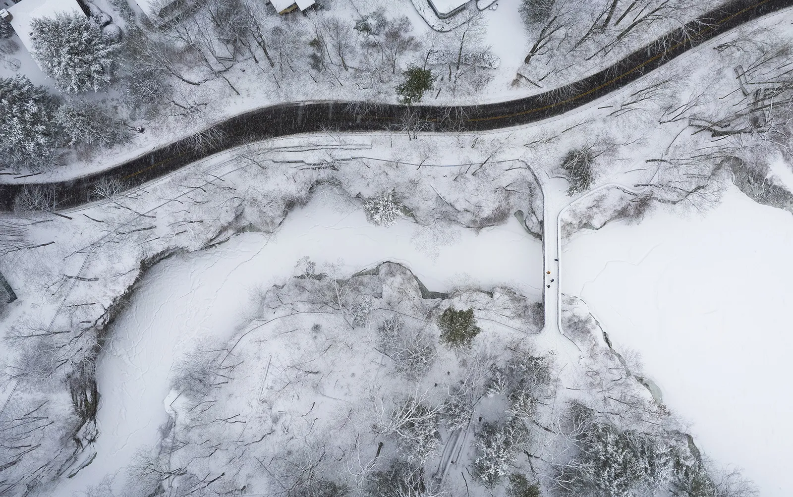 People walk across Sackett Bridge as it crosses over the confluence of Hemlock Gorge and Beebe Lake following a midwinter snowfall that dumped 4-6 inches of precipitation on Cornell's campus.