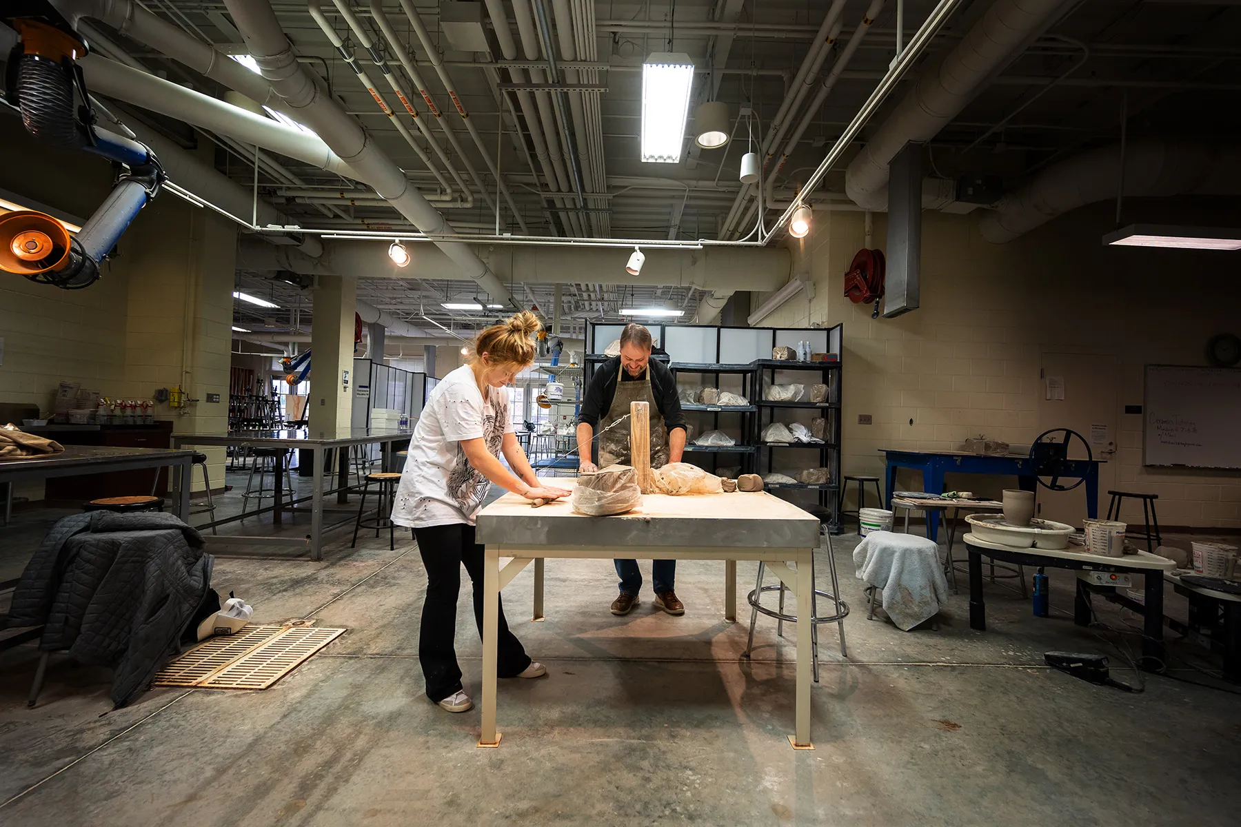 Ben Owens, a master potter from Sea Grove, NC, gives a student some hands-on instruction.
