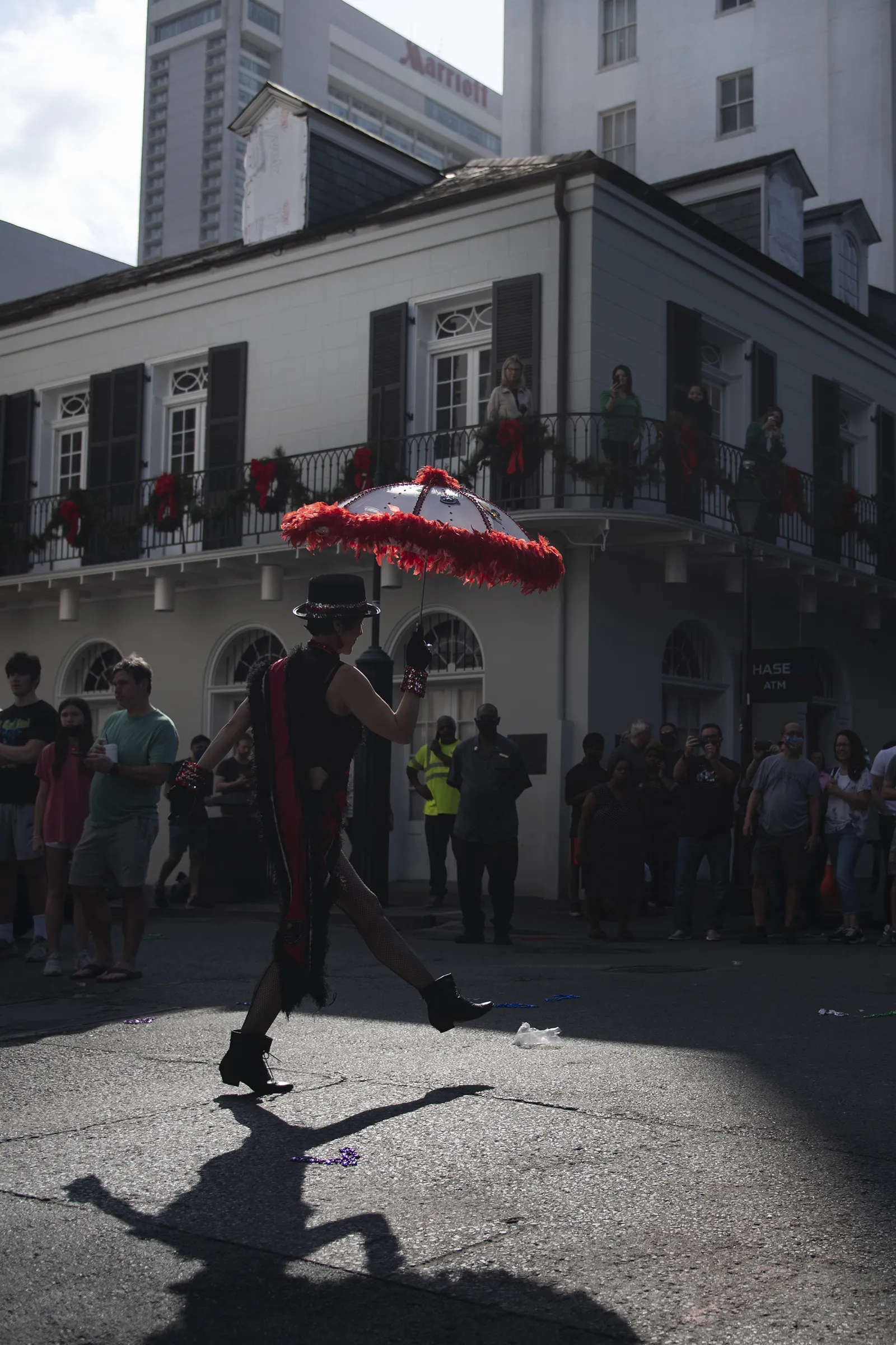 A member of the Second Line Allstate Sugar Bowl Parade dances in the light.