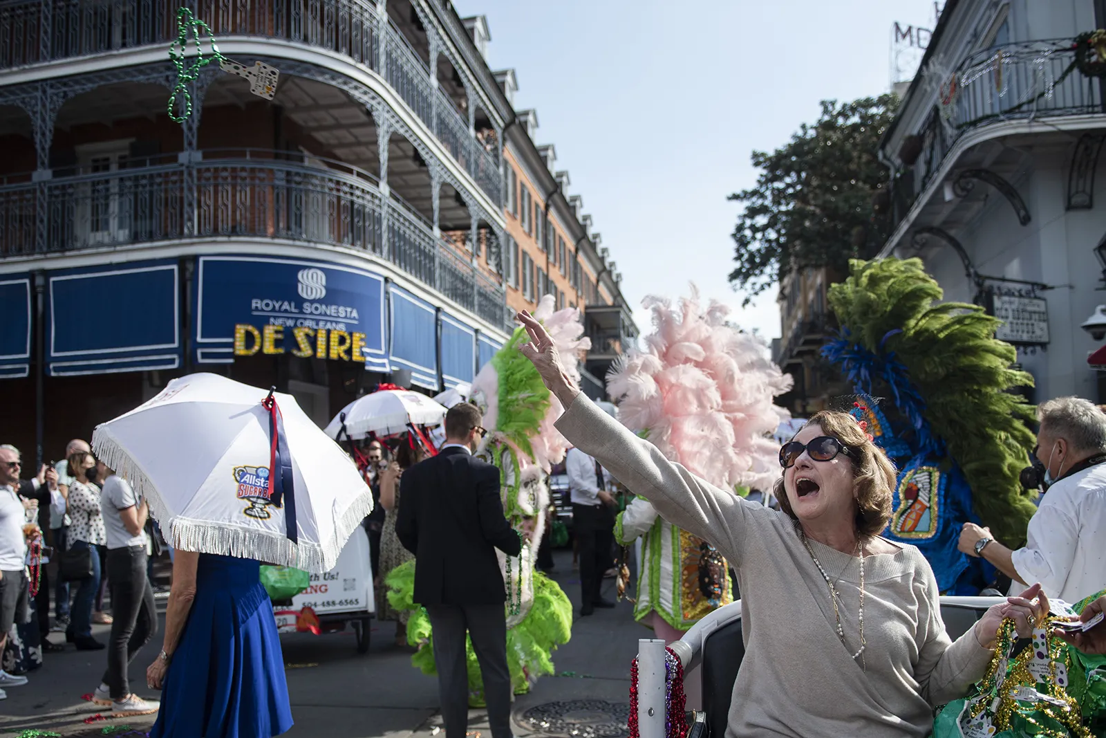 A participant of the Allstate Sugar Bowl Second line parade throws her beads into the air in New Orleans.