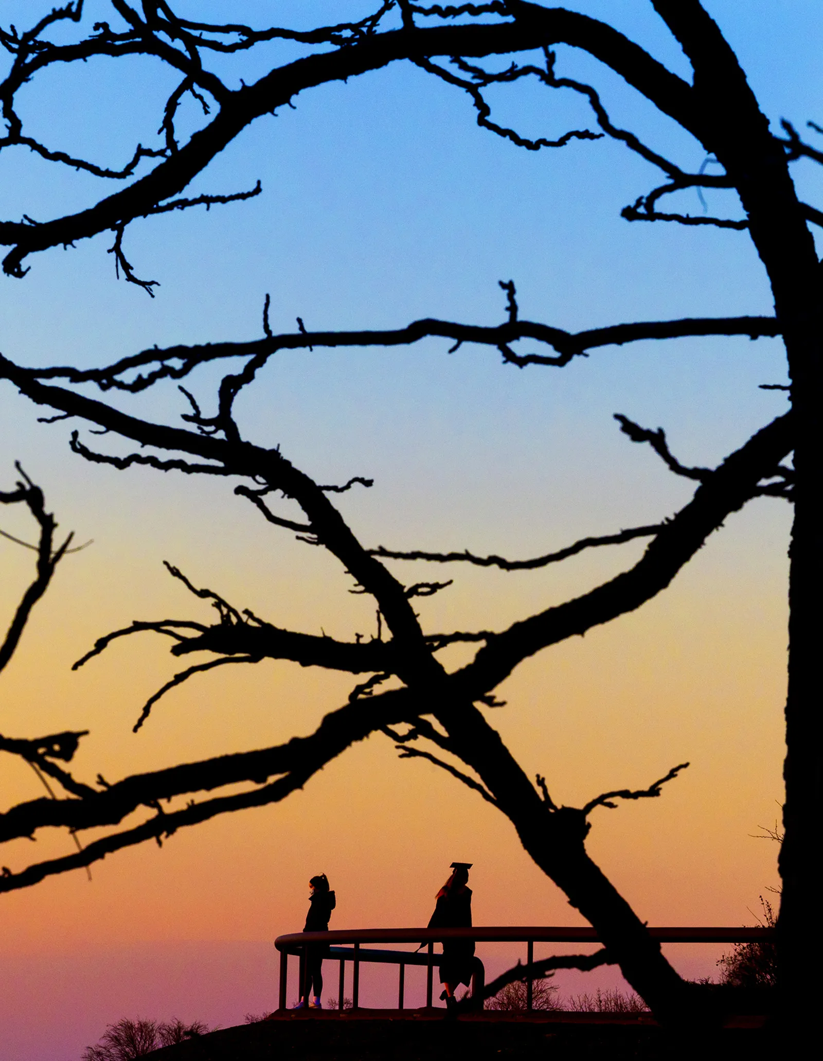 People take in the sunset and pose for graduation photos at the top of Libe Slope as seen through the branches of a bare tree.