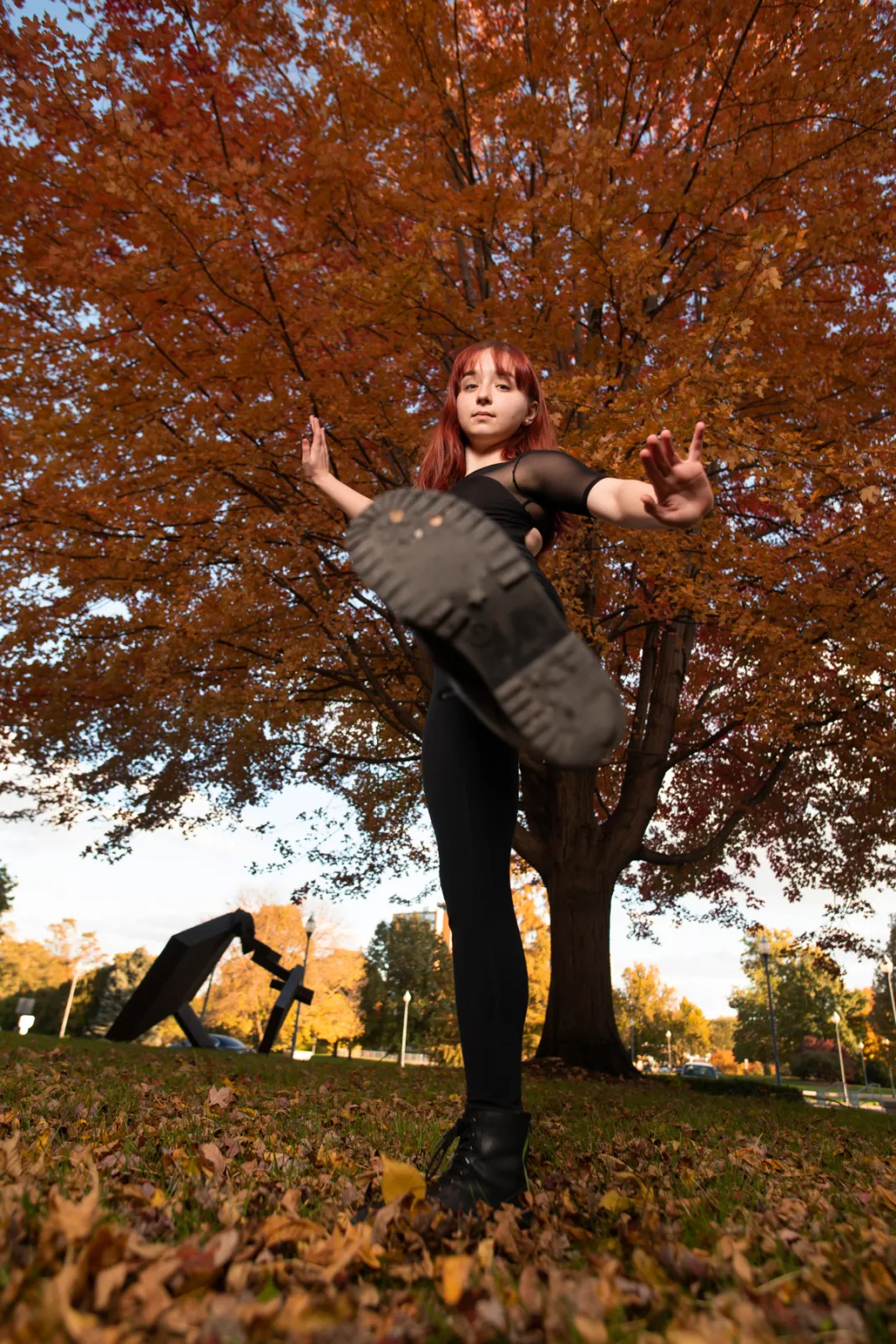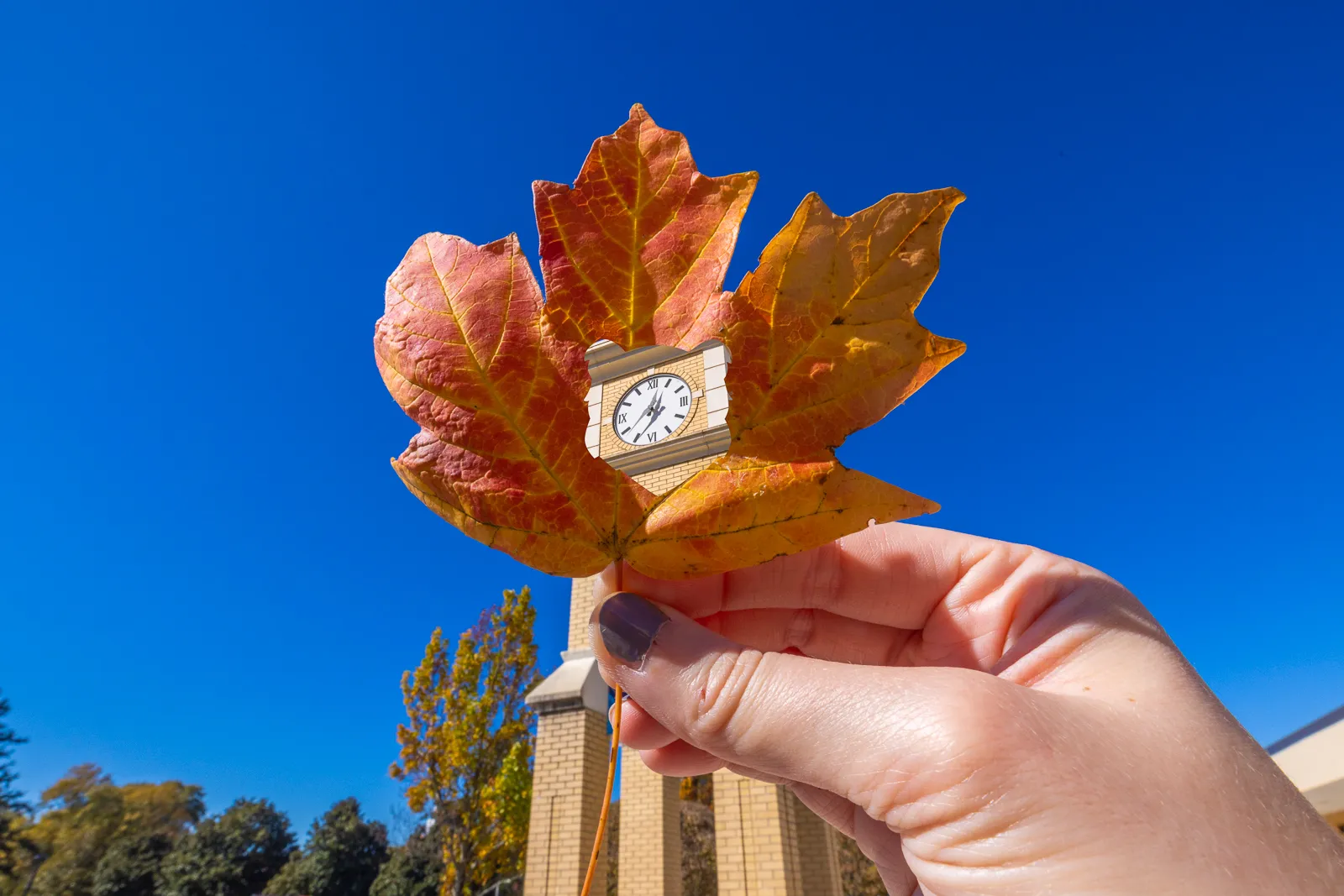 Fall leaf cutout into the university's mascot logo, framing up the school's clock.