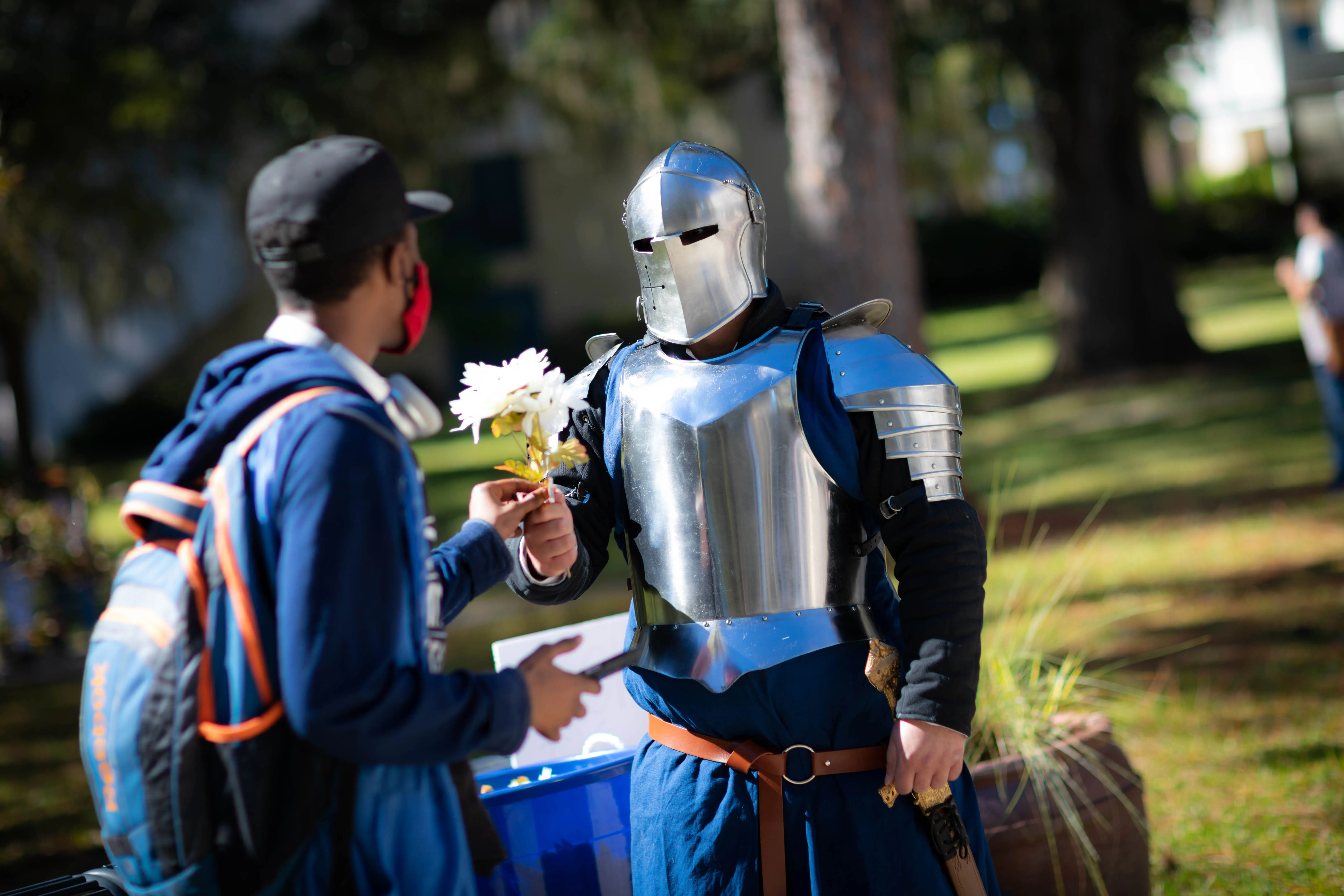 Santa Fe College student Roberto Garcia passes out flowers while dressed as a knight in front of the Lawrence Tyree Library on Nov. 16, 2021 in Gainesville, FL. Garcia said he got a discount on the flowers from work and just decided to pass them out on campus for fun toward the end of the semester.