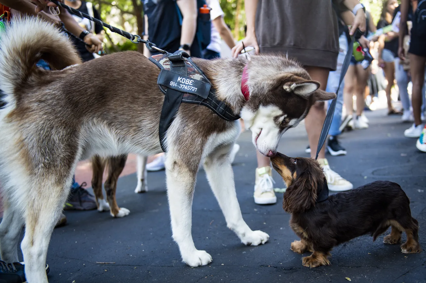 Husky Kobe meets dachshund Peanut during the annual fall festival to welcome students back to campus