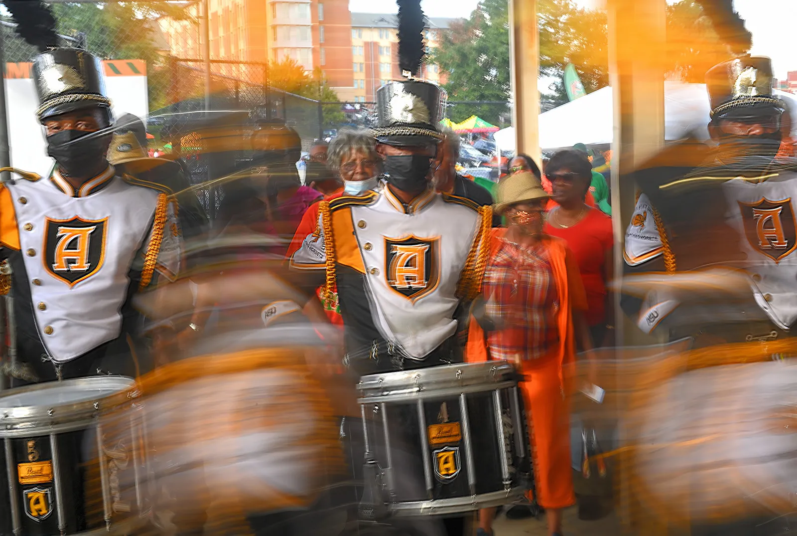 The drumline keeps a steady cadence as the Mighty Marching Hornets enter Florida A&M's stadium.