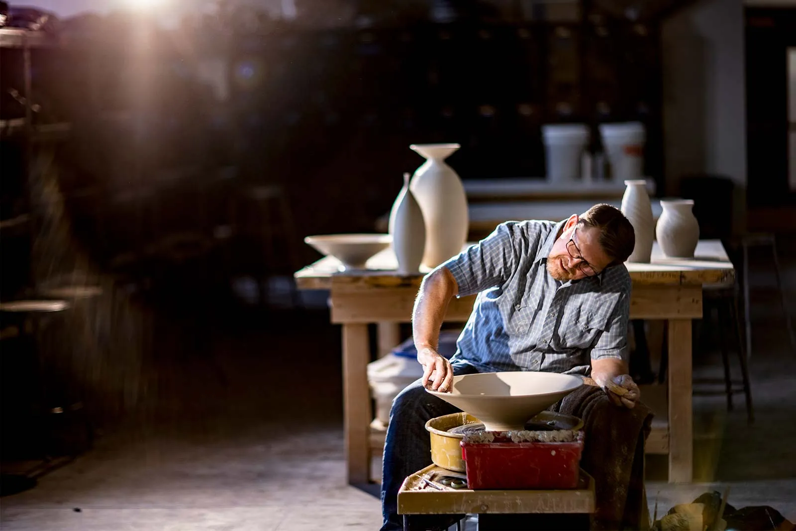School of the Arts faculty member Brian Jensen, Professor - Art/Visual Sculpture, works at at a wheel in the ceramics studio located in the Gunter Trades Building. The imagery was created for the cover of the Discovery Magazine distributed to the region households as a course catalog for the Continuing Education program.