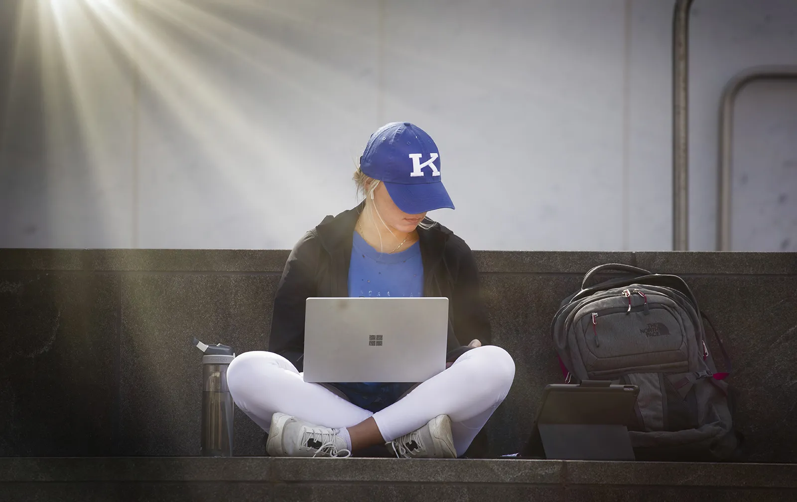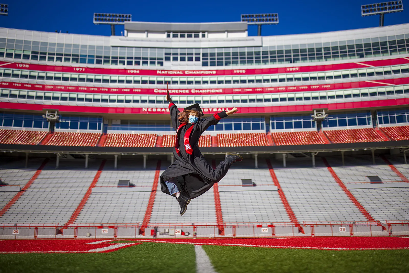 Macy Behrens, senior in advertising and public relations and also graphic design, leaps in regalia to announce spring commencement will be not only be held in-person but also in Memorial Stadium for the first time.