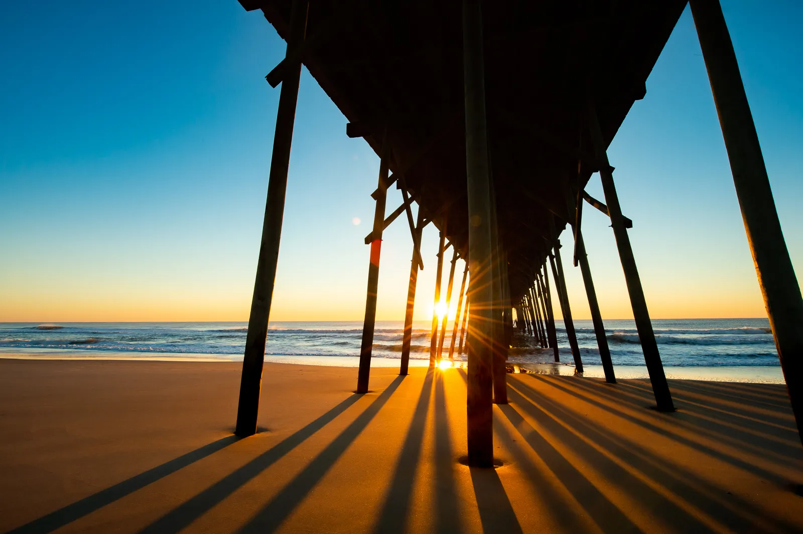 Sunrays are split by the wooden beams of a pier along the Atlantic Coast minutes after sunrise.
