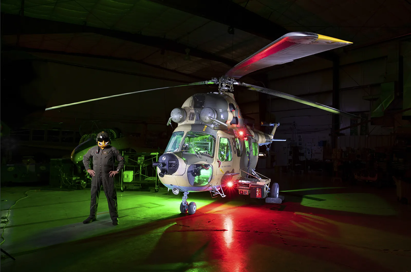 Operator Performance Laboratory Director Tom Schnell poses next to his research helicopter equipped with experimental night vision technology