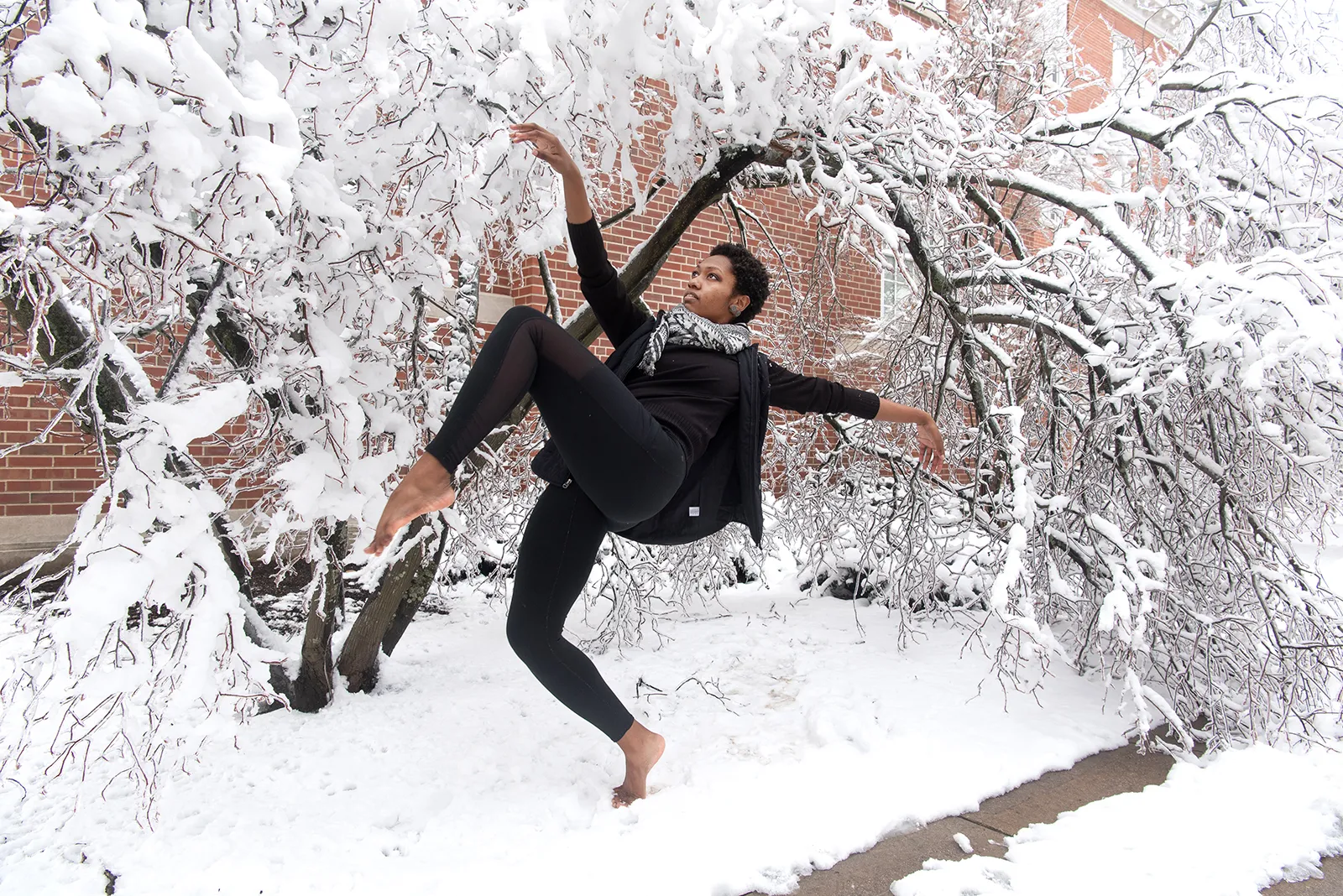 Senior Faith Minneyfield emerges from inside of a broken tree as she dances in the snow on the Quad.