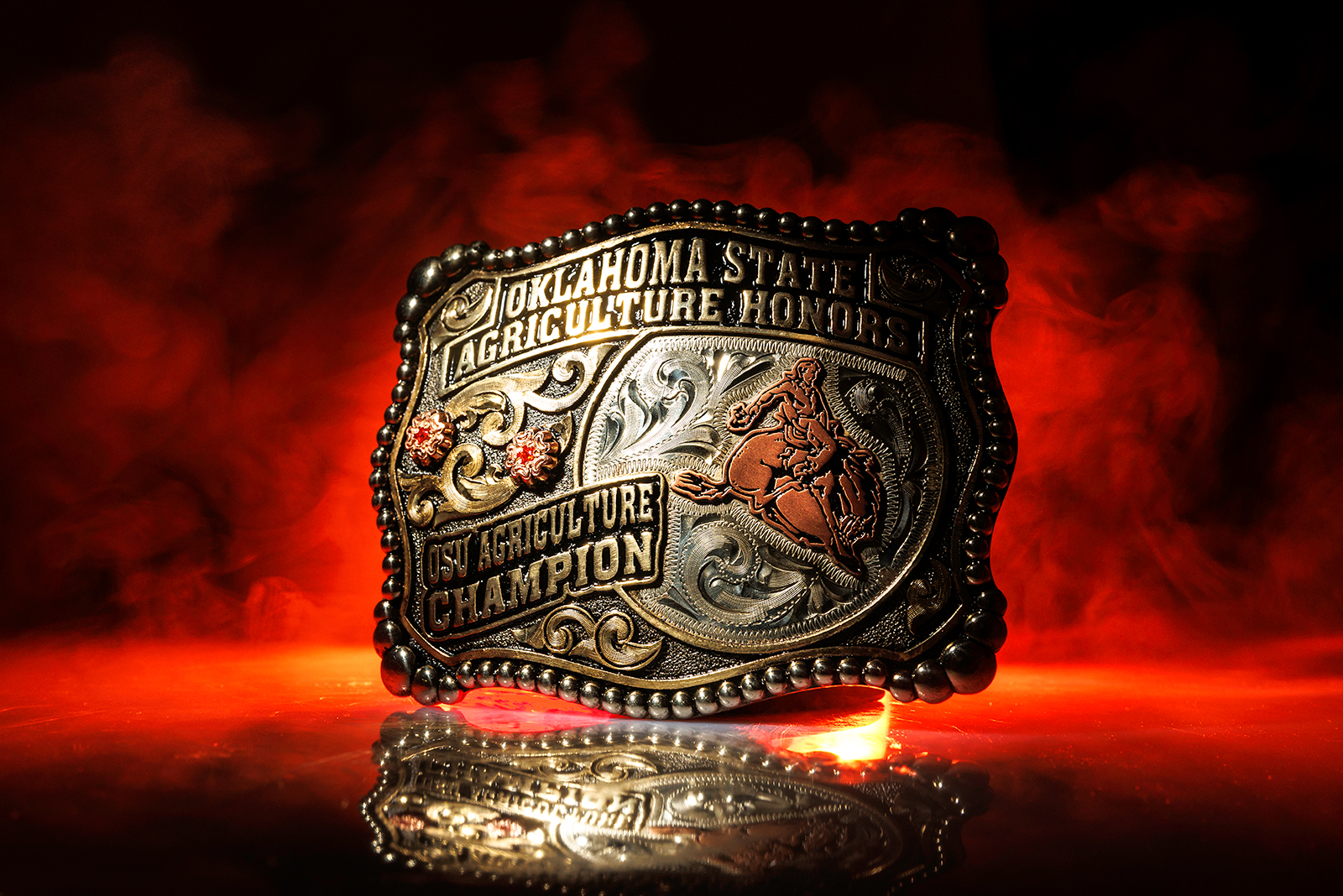 A photo shot in the studio of the Distinguished Alumni and Agriculture Champion belt buckle on Thursday, Aug. 29, 2024. Belt buckles are handed out at a ceremony in the fall semester to distinguished Alumni, and 2024 was the first year having belt buckles instead of medallions. The photos were used in various materials.