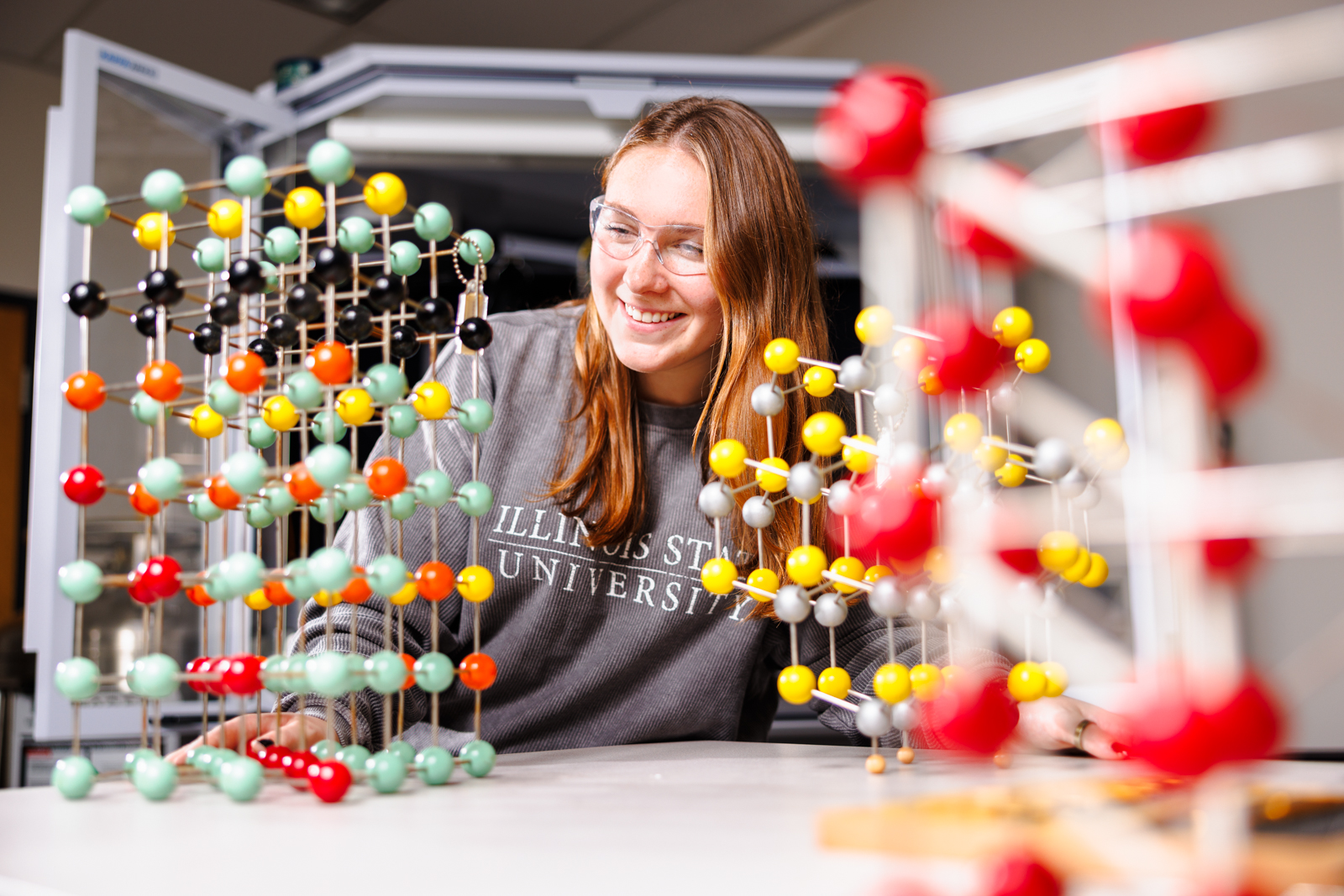Chemistry student Bella Rohrig poses between atom models for a university marketing photoshoot.