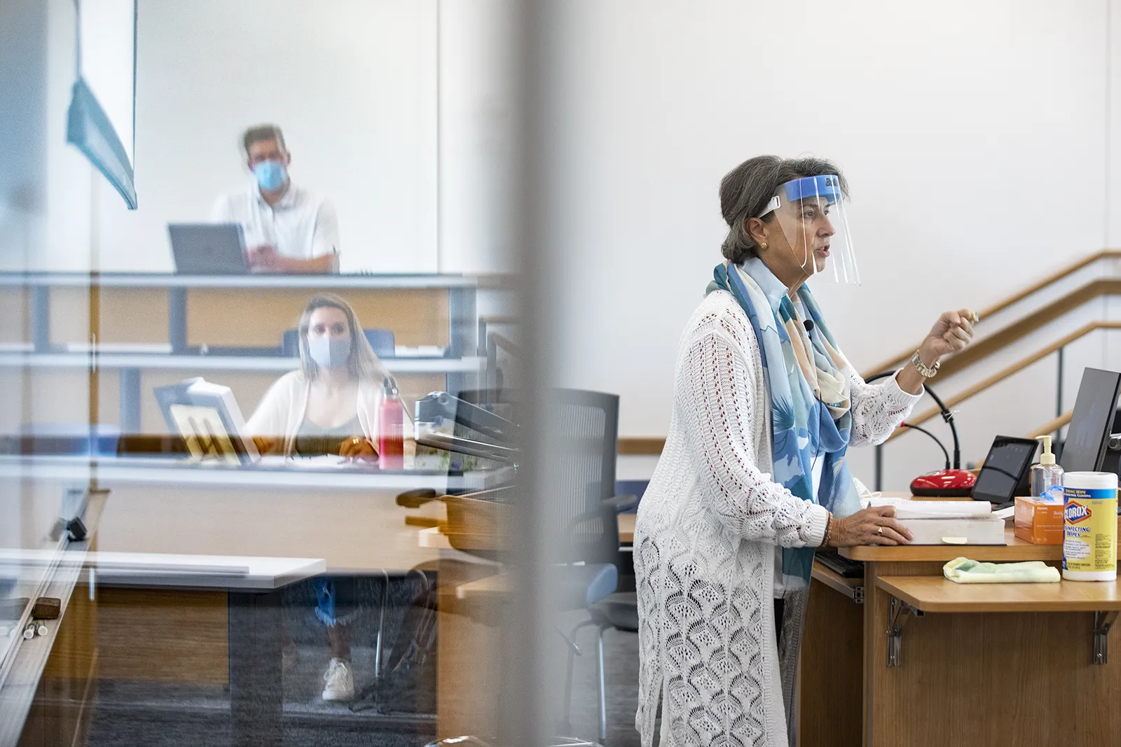 Mary Davis, Interim Dean of the College of Law, teaches her criminal law course with a face shield and a socially distanced classroom.