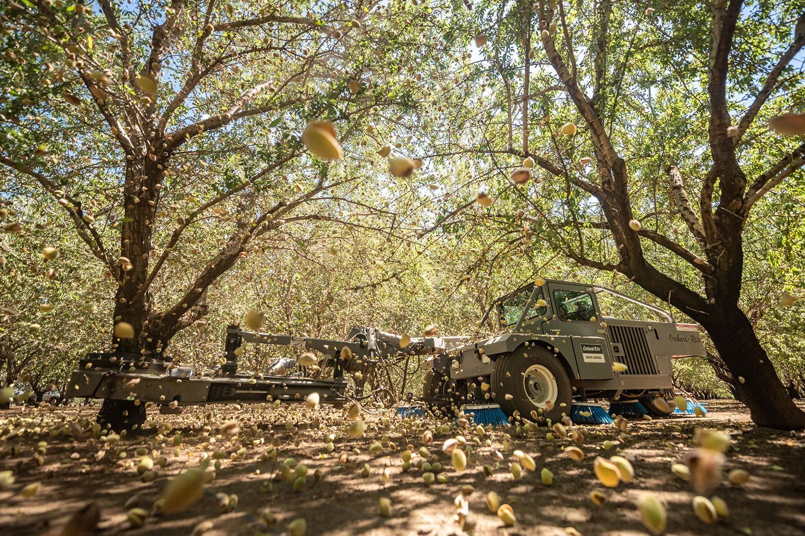An Orchard-Rite almond shaker is used to shake almonds out of the orchard trees at the University Farm on Thursday, August 13, 2020.