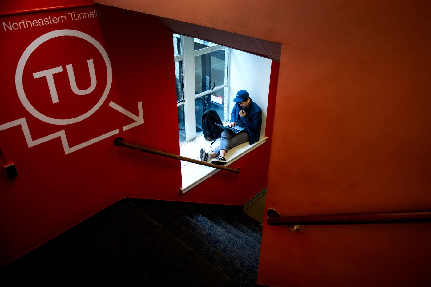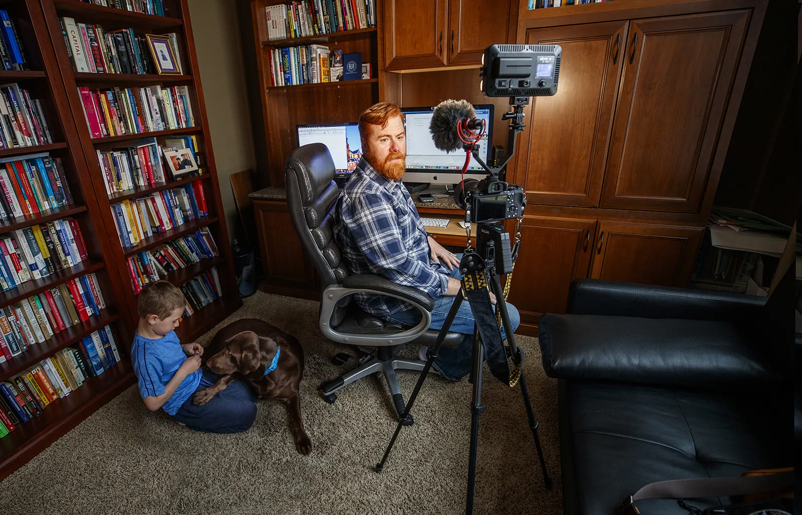 Tyler White records a lecture in his home office while his son, Gavin, 7, plays with their dog Ripley. White, Associate Professor of Practice in Political Science, was recording the lecture for for his course, National Security Studies 475 - Threats and Solutions to Global Security in the 21st Century as the university shifted to remote learning to combat the Covid19 virus. I photographed him from the doorway to his study. When you walk into a photo like this it sure makes all the emails to reach out to professors worth it!