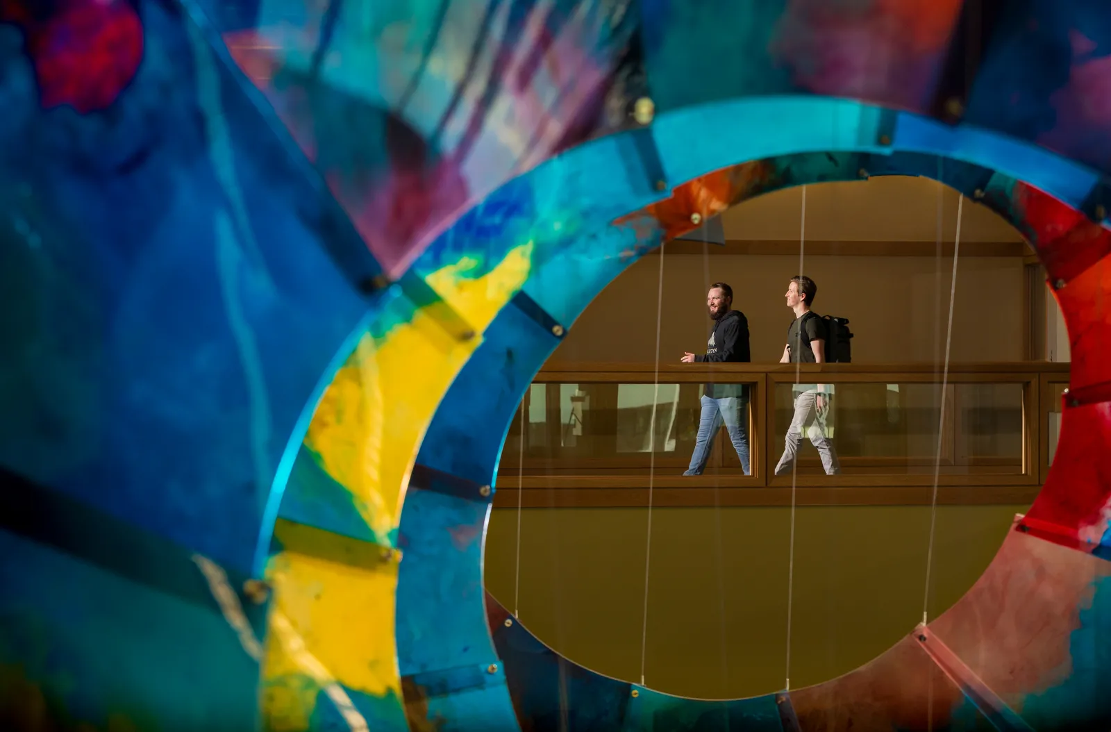Two students walk in the Fulton Library at Utah Valley University