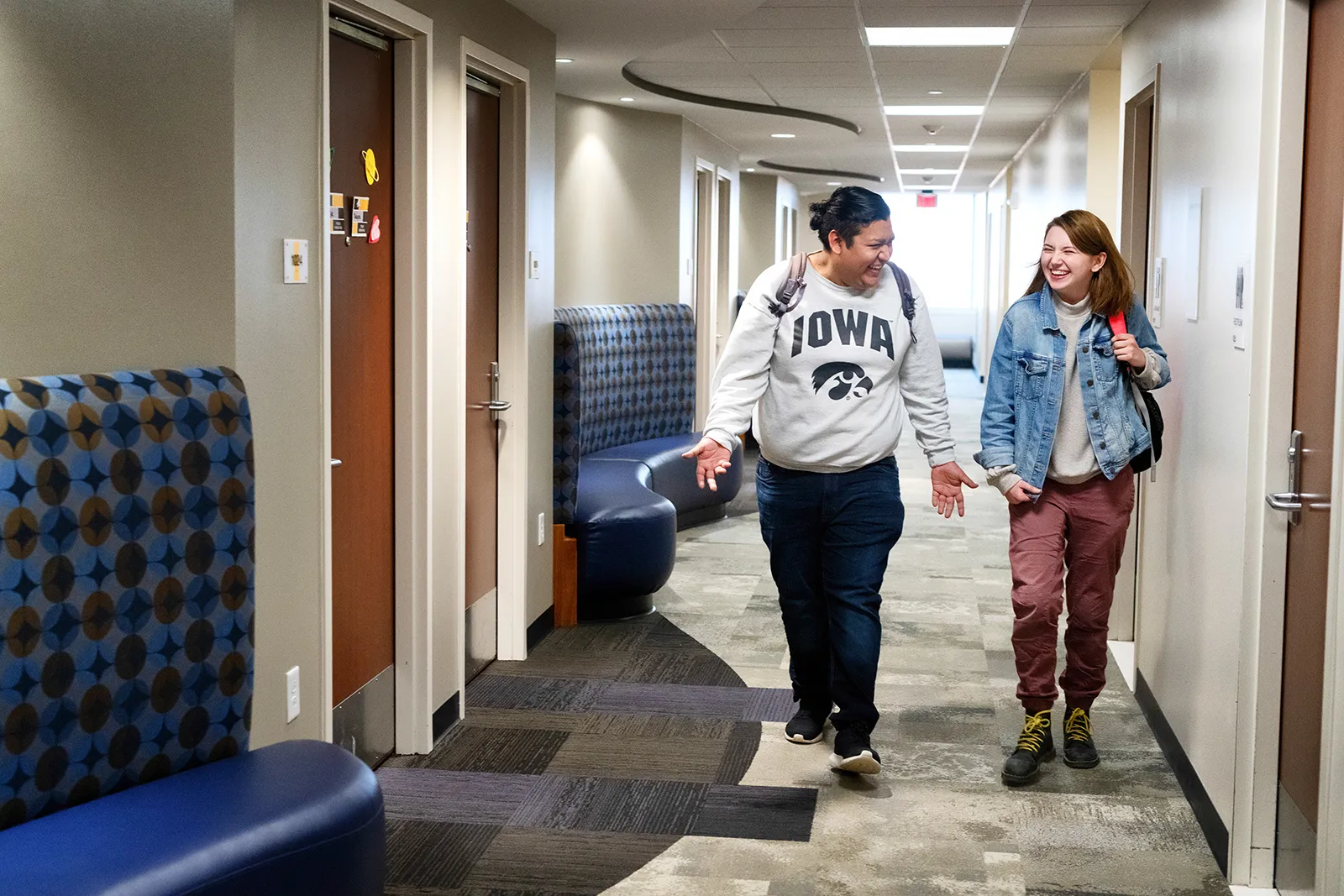 Students laugh at a joke as they make their way down the hallway of Petersen Hall.