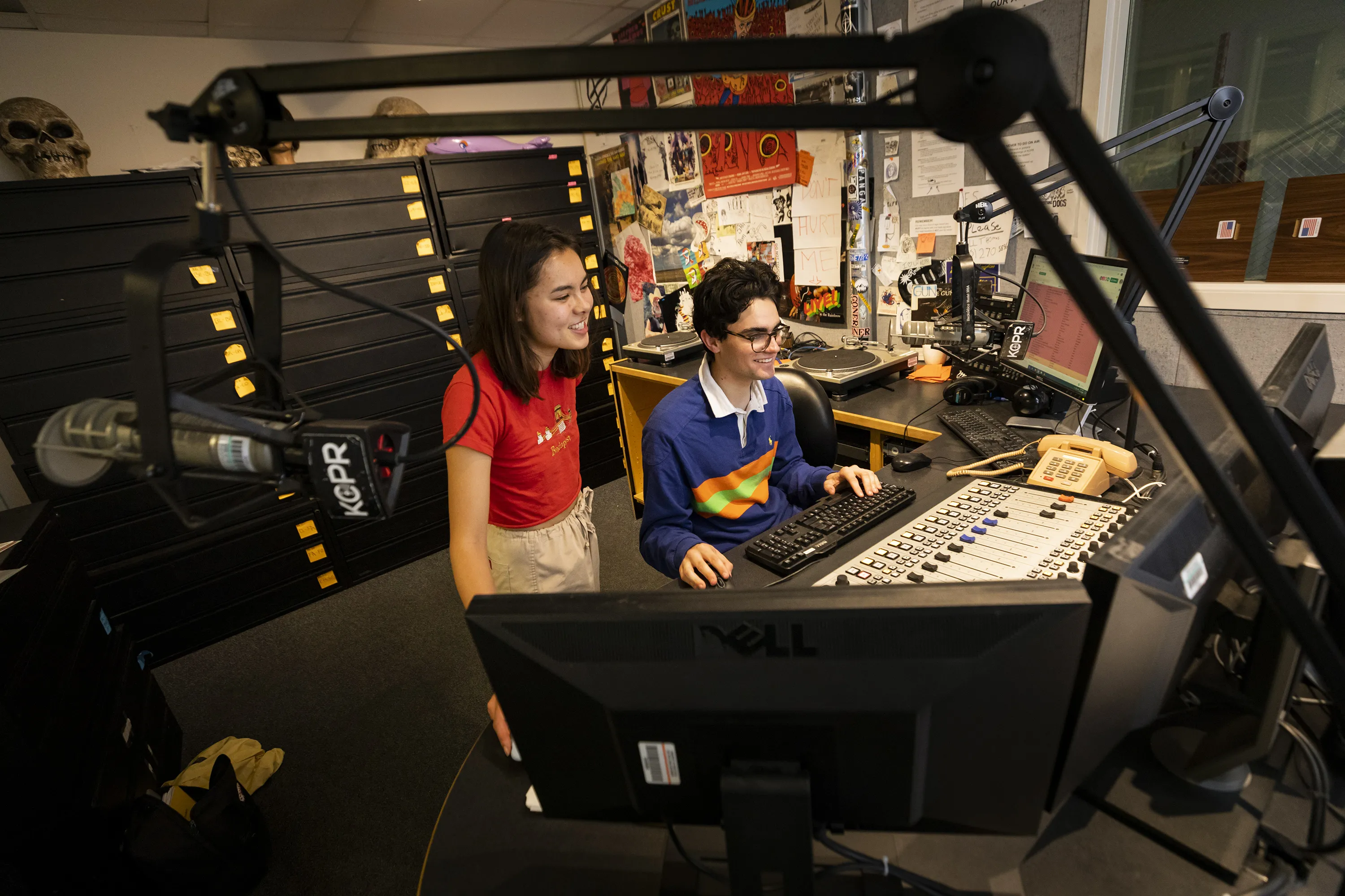 A college radio DJ works with his trainee to keep the music flowing on a winter evening.