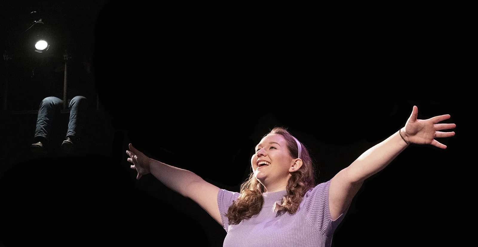 A theatre students holds a light on a performer during a photocall for Spitfire Grill.